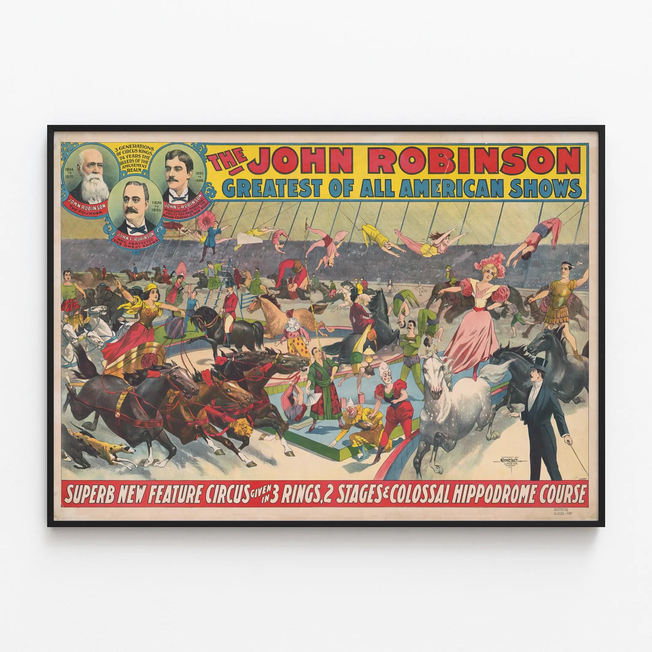 Découvrez cette affiche vintage captivante du John Robinson Circus, mettant en scène un spectacle spectaculaire donné dans trois rings et deux scènes au sein d'un hippodrome colossal. Cette décoration murale évoque l'âge d'or du cirque américain, avec une représentation animée de cavaliers, acrobates, clowns et artistes en costumes colorés, incarnant la magie et la variété des numéros proposés. L'illustration met en valeur plusieurs générations de la famille Robinson, célèbres pour avoir dirigé des shows de cirque pendant plus de 70 ans, avec des portraits emblématiques integrés dans le design. Ce poster est parfait pour apporter une touche rétro et dynamique à un intérieur, que ce soit dans une salle de séjour, un bureau ou une salle de jeux. Son style graphique et ses couleurs vives ajoutent une atmosphère festive et artistique à votre décoration murale. Idéal pour les amateurs d'art vintage, de cirque et d'affiches historiques, ce tableau mural permet de revivre l’émotion des spectacles équestres et acrobatiques, symboles d'un divertissement familial et populaire. Offrez à vos murs une pièce unique qui raconte une histoire riche en traditions et en prouesses artistiques.