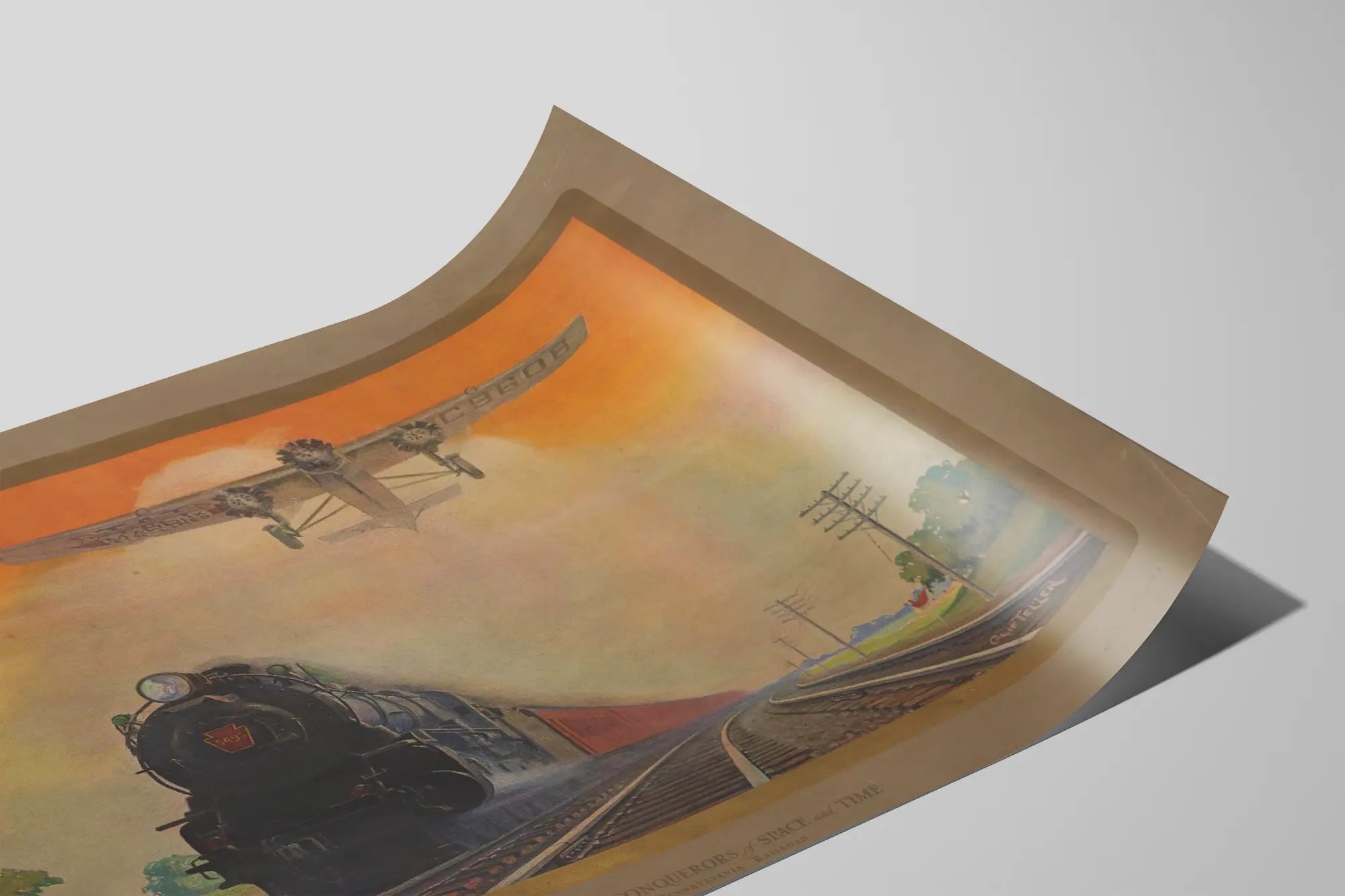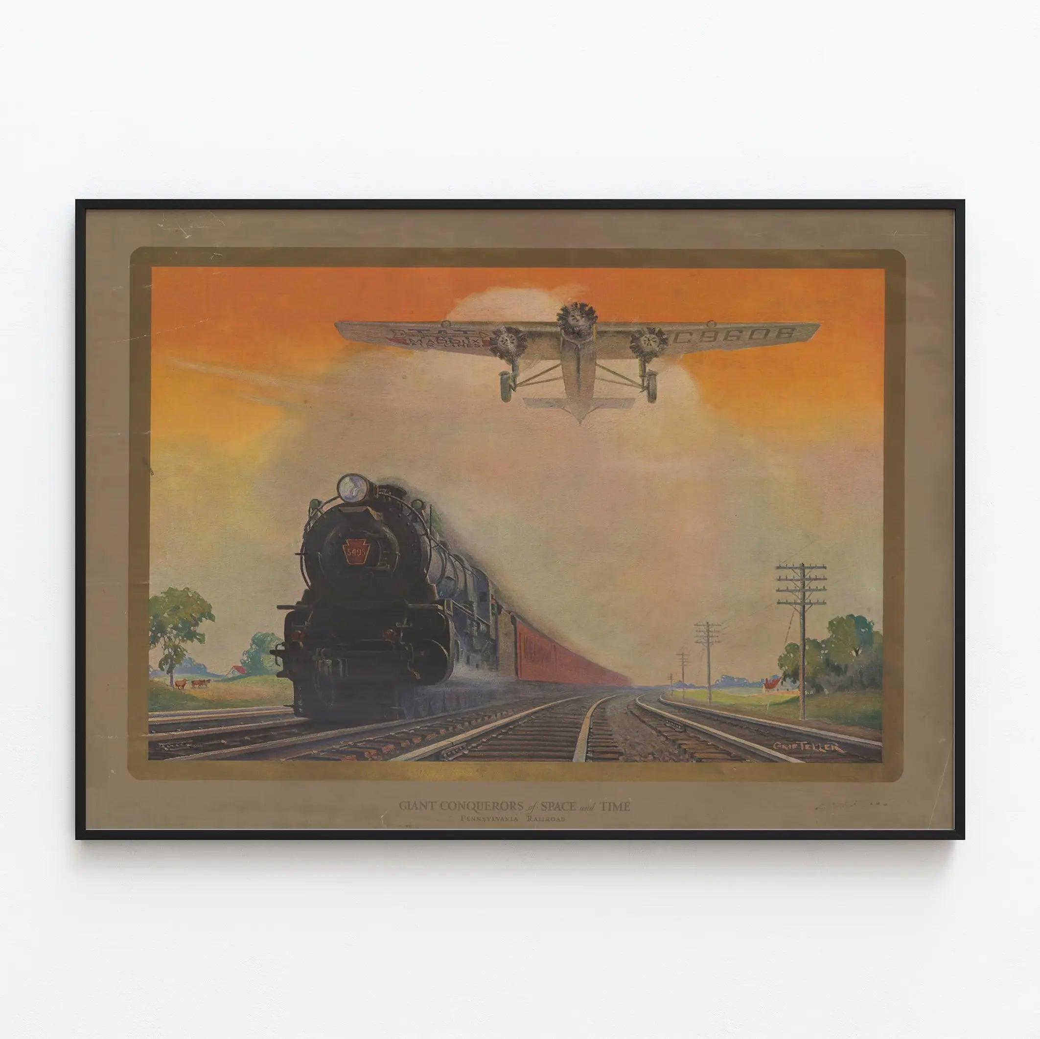 Tämä vintagejuliste nimeltä « Giganterit avaruuden ja ajan valloittajina » esittää voimakkaan höyryveturin etualalla, taustalla tyylitelty lentokone. Esittäen Pennsylvanian rautatieyhtiötä, tämä juliste viittaa avaruuden ja ajan valloittamisen teemaan 1900-luvun alun ikonisten kulkuneuvojen kautta. Dynaaminen visuaalinen koostumus esittää mustan veturin kiitävän raiteilla, lämpimän oranssinsävyinen taivas muodostaa voimakkaan kontrastin ympäröivän maaseudun kanssa. Nämä elementit luovat nostalgisen ja teollisen tunnelman tähän seinäkoristukseen. Tämä retrohenkinen taulu on täydellinen historiaa kulkuneuvoista, vintage-tyylistä ja aikakauden graafisesta suunnittelusta kiinnostuneille. Se sopii helposti sisustukseen, joka pyrkii korostamaan teollista tai nostalgista tunnelmaa, tehden tästä julisteesta sekä esteettisen että merkityksellisen seinäkoristeen. Ihanteellinen sisustukseen toimistossa, olohuoneessa tai vapaa-ajan huoneessa, tämä vintagejuliste rautatie- ja ilmailuteemalla on ehdoton valinta luomaan maailmaa, jossa tekniikka kohtaa seikkailun.
