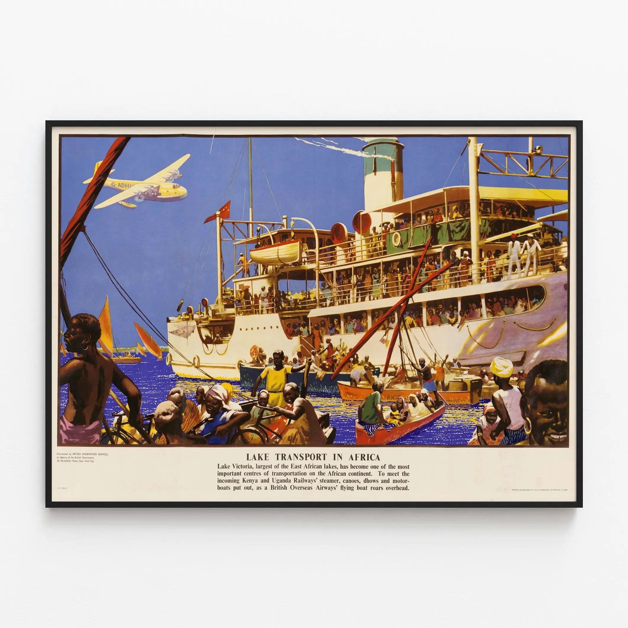 Tämä vintage- juliste paljastaa vilkkaan liikennekohtauksen Victoria-järvellä, Itä-Afrikan suurimmalla järvellä, joka on todellinen liikkuvuuden keskus mantereella. Maalaus esittelee höyrylaivan, jota ympäröivät lukuisat värikkäät kanoottit ja perinteiset kajakit, kirkkaan sinisen taivaan alla. Höyrylaiva, modernisuuden symboli, on ympäröity afrikkalaisilla matkustajilla, jotka ovat aktiivisina, kuvastaen eri liikennemuotojen monimuotoisuutta järven ympärillä. Taustalla British Overseas Airwaysin vesitaso lentää maiseman yli, luoden kontrastin perinteisille veneille ja tuoden mukaan historian ilmailun vivahteen. Tämä seinäkoriste viittaa Kenian ja Ugandan rautateiden historiallisesti merkittävään yhteyteen, joka yhdistää järven ympärillä asuvat ihmiset ja edistää kaupankäyntiä ja ihmisten välistä vuorovaikutusta. Tämä juliste on vahva koriste-elementti, joka yhdistää historian, kulttuurin ja estetiikan kirkkain värein ja dynaamisuudella. Ihanteellinen teemaseinälle, tämä juliste luo seikkailun ja löytöjen tunnelmaa sisätiloihisi, samalla kun kunnioittaa tärkeää hetkeä Afrikan liikenteen kehityksessä. Olipa kyseessä olohuone, toimisto tai odotustila, tämä taulu jäljentää hienovaraisesti Victoria-järven rannikon yksityiskohtia ja elämän rikkautta, tehden siitä täydellisen retro-taiteen ja historiallisten kuvien harrastajille.