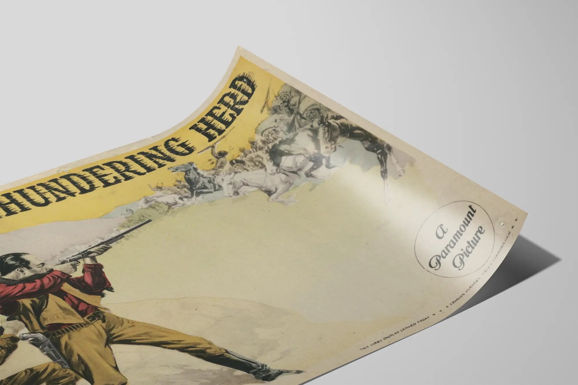 Kannen teksti "The Thundering Herd" on mustilla, hieman kuluneilla isoilla kirjaimilla, ja siihen liittyvä nimi "Zane Grey", kuuluisa lännenromaanien kirjoittaja, korostavat julisteen vintage- ja teemallista vaikutelmaa, vahvistaen sen aitoutta ja viehätystä.