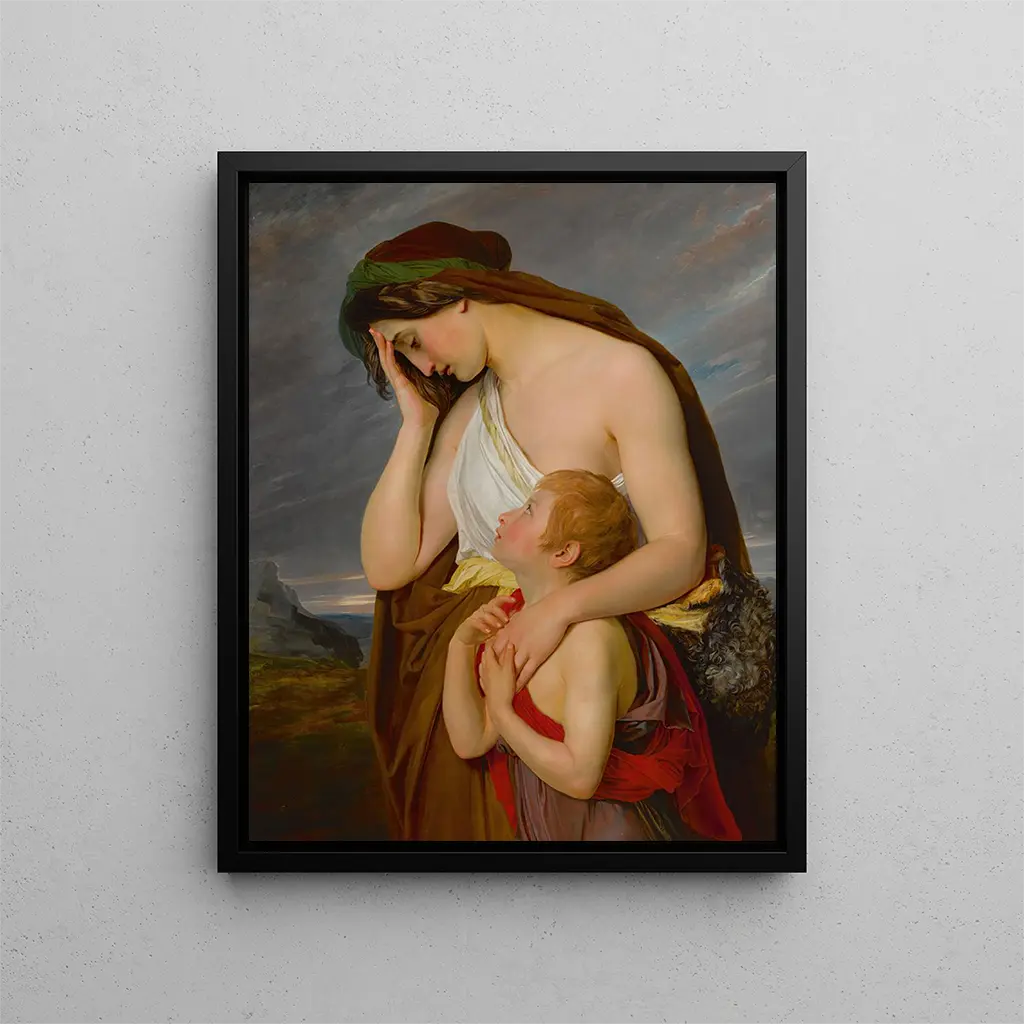 L'esthétique de "Agar et Ismaël" se distingue par une palette de couleurs chaudes et terreuses, qui évoque une certaine intimité. Les détails minutieux des vêtements et des traits des personnages témoignent d'un savoir-faire exceptionnel, typique de l'École Continentale. Chaque coup de pinceau semble chargé d'émotion, et l'artiste parvient à insuffler une vie authentique à ses sujets. La composition, soigneusement orchestrée, guide le regard du spectateur à travers le tableau, mettant en lumière la relation entre Agar et son fils. L'utilisation de la lumière et de l'ombre renforce le drame de la scène, accentuant les expressions de détresse et de protection. Cette œuvre ne se contente pas d'être une simple illustration ; elle devient une narration visuelle, un poème pictural qui évoque les luttes humaines tout en célébrant la force de l'amour maternel.