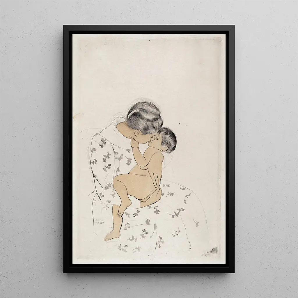 Taidegrafiikka "Baiser de la mère" Mary Cassattilta kuvaa intiimiä ja koskettavaa kohtausta, jossa äiti halaa lempeästi lastaan. Pehmeät ja pastellivärit, jotka ovat Cassattin teoksen tunnusmerkkejä, luovat lämpimän ja lohduttavan ilmapiirin. Taiteilijan impressionistinen tekniikka, hienovaraiset siveltimenvedot, herättävät tämän hellyyden hetken eloon ja tallentavat hetkellisen suukon. Pehmeä valo, joka valaiseee teoksen, korostaa kasvojen lempeyttä, kun taas vaatteiden ja ilmeiden hienovaraiset yksityiskohdat välittävät syvää yhteyttä äidin ja lapsen välillä.