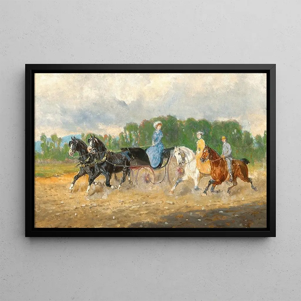 "Promenade en voiture" -teoksessa Alexander von Bensa kuljettaa meidät idylliseen kohtaukseen, jossa luonto ja ihmiskunta elävät harmonisesti rinnakkain. Kompositio, joka on täynnä yksityiskohtia, korostaa vehreää maisemaa, joka kylpee pehmeässä valossa. Värit, jotka vaihtelevat kirkkaista vihreistä maanläheisiin sävyihin, luovat rauhallisen ja vieraanvaraisen tunnelman. Taiteilijan tekniikka, joka yhdistää taitavasti realismia ja impressionistisia vivahteita, kutsuu katsojan kokemaan tämän pysäytetyn hetken rauhan. Jokainen elementti, ajoneuvosta majesteettisiin puihin, vaikuttaa kertovan tarinan, luonnossa vietetystä pakomatkasta.