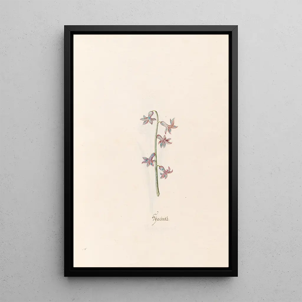 Magdalena Rosina Funckin taidegrafiikka Jacinthes kuvaa rehevää puutarhaa, jossa kukat kukoistavat kirkkain värein. Jacinthes, joiden sävyt vaihtelevat syvästä violetista herkkään roosaan, on aseteltu huolellisesti, luoden harmonisen kokonaisuuden, joka houkuttelee katsojan huomion. Öljyvärimaalauksen tekniikka mahdollistaa pehmeiden terälehtien tekstuurin vangitsemisen, kun taas valo leikkii pinnalla, lisäten teokseen lähes kosketeltavan ulottuvuuden. Tämä kangas huokuu rauhoittavaa ja iloista tunnelmaa, kutsuen ihailemaan luonnon ohikiitävää kauneutta.