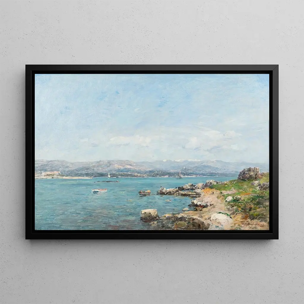 Tässä taidegrafiikka-antibesin, lahdella, Eugène Boudin vangitsee Rivieran säteilevän kauneuden. Kankaalle heijastuu valo, ja sinisen ja vihreän sävyt muistuttavat auringon alla välkehtivästä merestä. Laivojen valkoiset purjeet kontrastoivat ympäröivän maiseman kanssa, luoden rauhallisen ja elävän tunnelman. Boudinin impressionistinen tekniikka, joka on tunnusomaista nopeille ja sulaville siveltimenvetoille, herättää tämän merimaiseman eloon ja kutsuu katsojan tuntemaan merituulen ja päivän säteilyn.