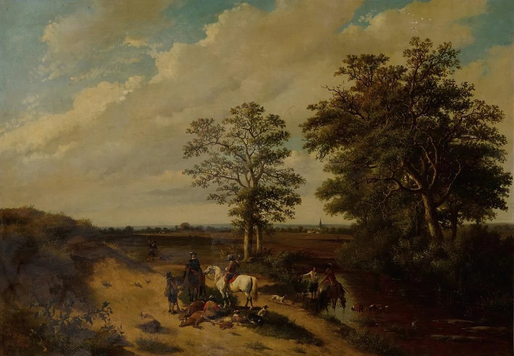 Artiste néerlandais du XIXe siècle, Johann Bernhard Klombeck est reconnu pour ses paysages et scènes de chasse qui capturent l'essence de la vie rurale. Influencé par le romantisme, il s'inspire des grands maîtres de la peinture de paysage, tout en développant un style personnel qui met l'accent sur la lumière et la couleur. Klombeck a su immortaliser des scènes de la vie quotidienne avec une sensibilité unique, faisant de lui une figure importante de son époque. Ses œuvres, souvent empreintes de mélancolie, reflètent une profonde connexion avec la nature et un respect pour les traditions rurales.