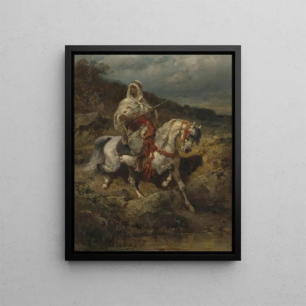 Sukellus Adolf Schreyerin eloisaan maailmaan, taidetuloste Arabe monté - Adolf Schreyer kutsuu visuaaliseen kiehtovaan tutkimusmatkaan. Tämä ikoninen teos, joka on valmistettu 1800-luvulla, todistaa taiteilijan intohimosta orientalistista taidetta kohtaan, taidesuuntausta, joka on lumonnut monien aikalaistensa mielikuvituksen. Teos kuvaa majesteettista arabialaista hevosta, joka symboloi jaloutta ja voimaa, ratsastajan selässä, jonka asento ja varustus paljastavat alueen kulttuurisen ja historiallisesti rikkaan perinnön. Värien loisto ja yksityiskohtien huolellisuus luovat dynaamisen ja runollisen kohtauksen, tarjoten katsauksen häikäisevän kauniisiin maisemiin ja itäisiin perinteisiin.