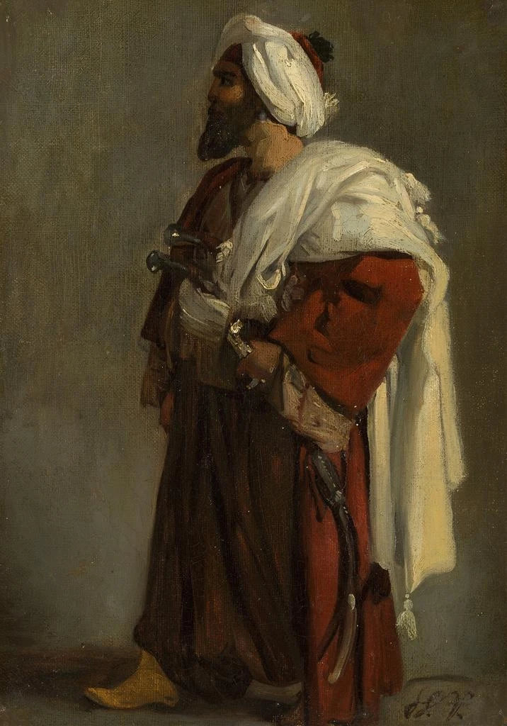 Kohteessa "Guerrier arabe" Horace Vernet kuvaa majesteettista hahmoa, joka symboloi voimaa ja arvokkuutta. Taulu, joka on täynnä kirkkaita värejä ja huolellisia yksityiskohtia, kuljettaa katsojan maailmaan, jossa sankaruus ja jalous yhdistyvät. Vernet käyttää öljyvärimaalauksen tekniikkaa, joka korostaa vaatteiden ja aseiden tekstuureja, luoden sekä realistisen että eeppisen tunnelman. Taitavasti työstetyt varjot ja valot lisäävät syvyyttä kohtaukseen, tehden soturista lähes elävän, valmiina syöksymään taisteluun.