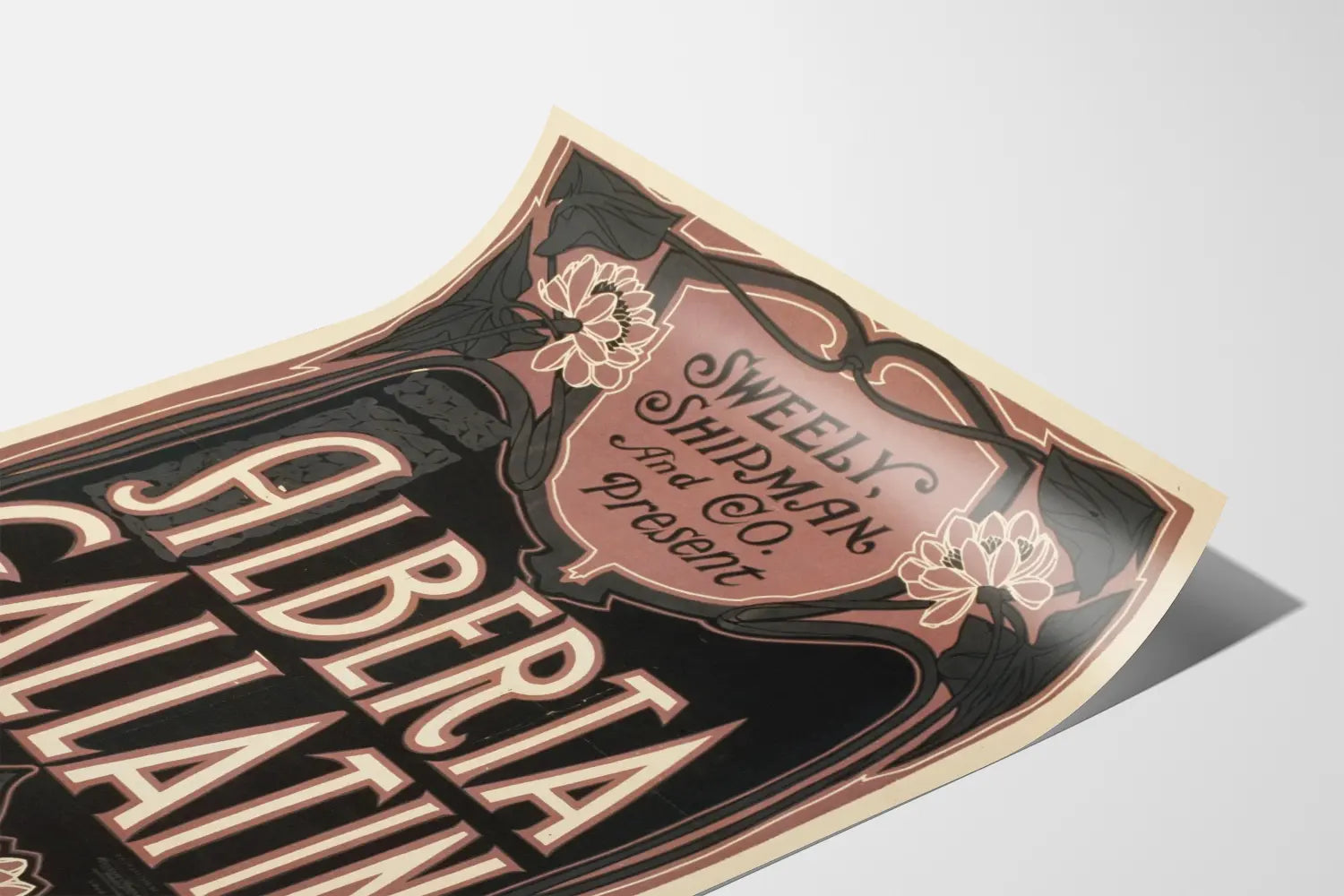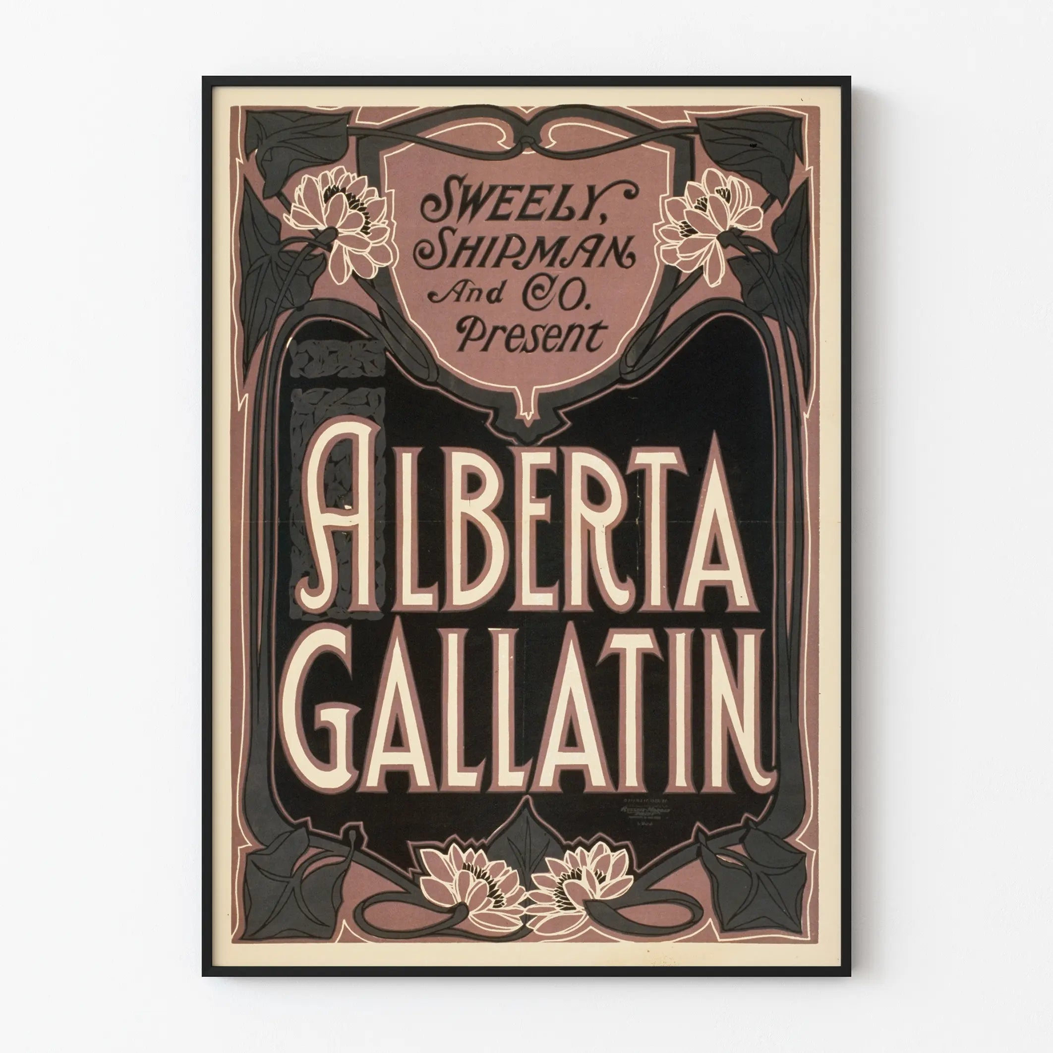 Tämä Art Nouveau -tyylinen juliste esittelee tyylikkään ja typografisen suunnittelun, jossa on nimi "Alberta Gallatin". Se erottuu hienovaraisella väripaletillaan, joka yhdistää harmaanpunertavia, mustia ja kermaisia sävyjä, luoden retro- ja hienostuneen tunnelman. Kompositio on kehystetty tyylitellyillä kukkamuodoilla, jotka on tunnistettavissa valkoisista kukista, joissa on yksityiskohtaiset terälehdet ja suuret lehdet, antaen kokonaisuudelle orgaanisen ja koristeellisen ilmeen. Isot, leveät ja kevyesti varjostetut kirjaimet sulautuvat harmonisesti koristeelliseen kehykseen, jossa on kaarevia voluutteja ja pyöreäsivuisia geometrisia muotoja. Yläosassa pieni merkintä "Sweely, Shipman and Co. Present" lisää aitouden ja kaupallisen kontekstin tuntua tälle visuaaliselle teokselle. Tämä vintage-juliste toimii täydellisenä seinäkoristeena, tuoden sisustukseesi klassisen ja taiteellisen sävyn. Olipa kyseessä olohuone, toimisto tai galleria, tämä juliste kutsuu eleganttiin ja hienostuneeseen pohdintaan, kunnioittaen 1900-luvun alun estetiikkaa. Sen ikoninen graafinen tyyli ja Art Nouveau -muotoilu tekevät eron koristellessasi seinäsi omaperäisyydellä ja viehättävällä charmilla, samalla tuoden esiin historiallista ja visuaalista vetovoimaa. Tämä seinäkoriste viehättää vanhan typografian ja vahvasti tyyliteltyjen graafisten luomusten ystäviä.
