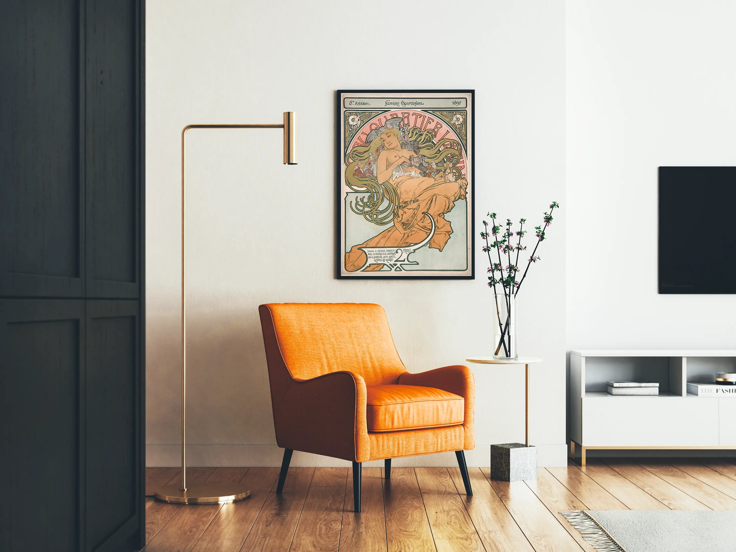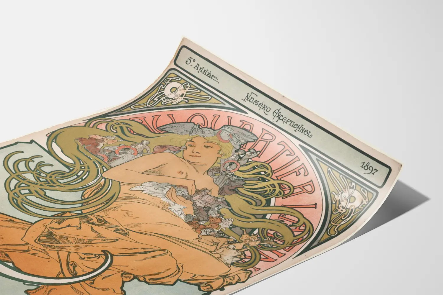Tämä 1897 vuosikertajuliste, nimeltään « Au Quartier Latin », on tyyliltään Art Nouveau -liikkeen edustava teos. Se tarjoaa ainutlaatuisen ja tyylikkään seinäkoristeen, joka sopii täydellisesti lisäämään tiloihisi retroa ja taiteellista charmia. Tämä vanha juliste kuvaa pitkät kiharat hiukset omaavaa naista, joka on kevyesti paljastettu, ja hän on asennoltaan arvokas ja uneksiva. Hänen kehonsa ympärillä on pieniä ihmishahmoja, jotka viittaavat vilkkaaseen ja yksityiskohtaisiin kohtauksiin. Julisteen tausta ja ääriviivat on koristeltu Art Nouveau -liikkeen tunnusomaisilla tyylitellyillä kuvioilla, jotka yhdistävät kaarevia linjoja ja orgaanisia muotoja pehmeän väripaletin kanssa, johon pääasiassa kuuluvat oranssi, beige, vihreä ja vaaleansininen. Tämä alkuperäinen teos oli alun perin erikoisnumeron kansilehti, jossa näkyvät typografiset merkinnät kuten « 5. vuosi », « Erikoisnumero » ja vuosi « 1897 ». Sen houkutteleva teksti kehottaa ostamaan Quartier Latin -albumia, viitaten solidaarisuuteen. Tämä juliste on sekä keräilyesine että poikkeuksellinen seinäkoriste, joka täydentää taiteellista ja historiallista tunnelmaa sisustuksessa. Se sopii erinomaisesti olohuoneeseen, työhuoneeseen tai lukutilaan, tuoden hienostuneen ja kulttuurisen vivahteen. Valitsemalla tämän vuosikertajulisteen valitset graafisen ja esteettisen julisteen, joka symboloi 1800-luvun lopun taiteellista rikkautta, ja on ihanteellinen alkuperäisestä seinäkoristeesta ja taiteen historian harrastajille.