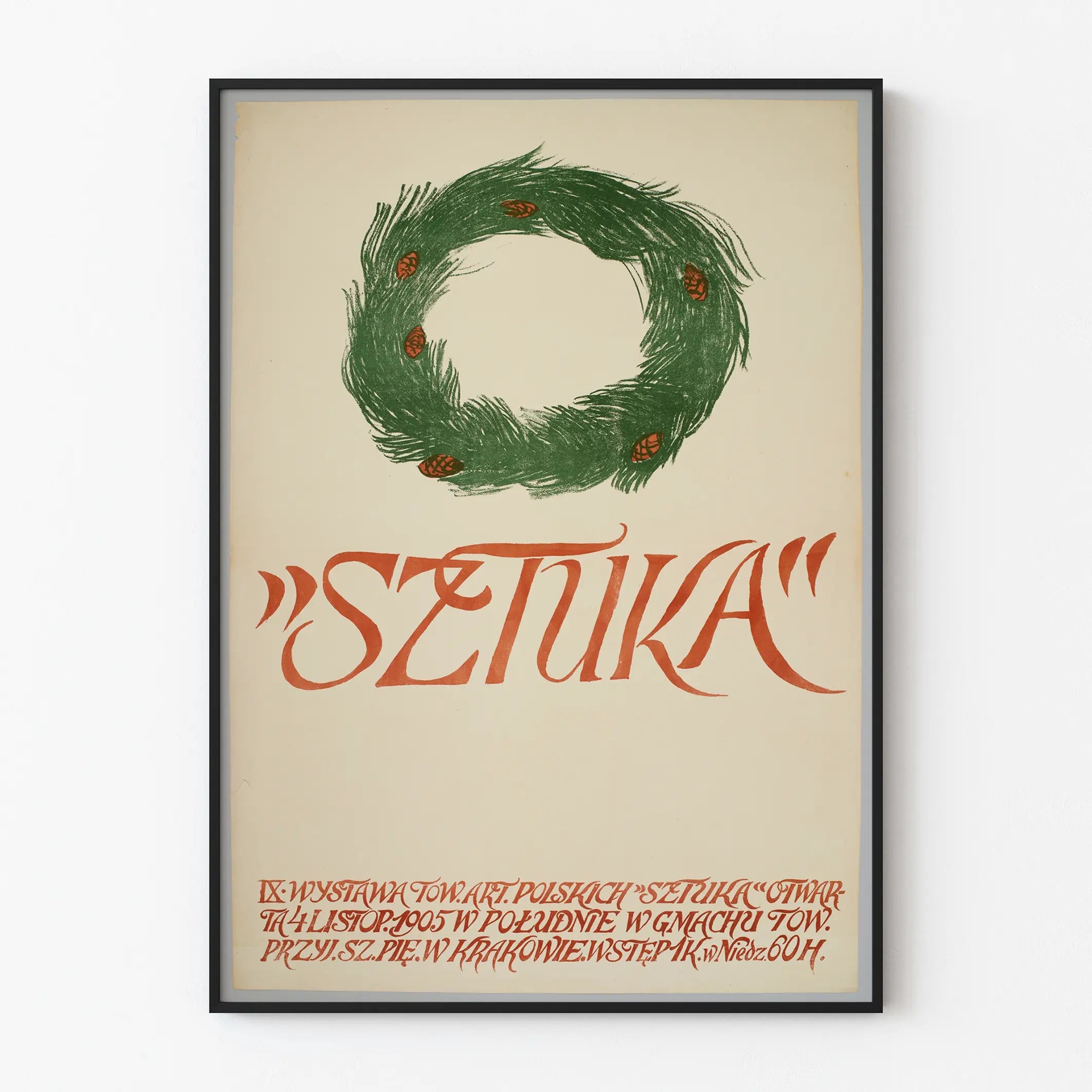 Tutustu tähän Art Nouveau -tyyliseen vintage-plakaattiin, joka on tehty « Towarzystwo Artystów Polskich » -järjestön yhdeksännen näyttelyn, nimeltä « Sztuka », yhteydessä. Tämä ikoninen juliste kuvaa vihreän seppeleen, jossa on punaisia mäntytikkuja, piirretty sulavalla ja ilmeikkäällä viivalla. Punaisella käsin kirjoitettu teksti, sekä keskellä että alareunassa, korostaa tämän graafisen asiakirjan käsityöläisyyttä ja historiallista arvoa. Vuodelta 1905 peräisin oleva puolalainen juliste on aito teos, joka todistaa varhaisten taiteilijaliikkeiden noususta Itä-Euroopan alueella 1900-luvun alussa. Täydellinen taiteen harrastajille ja vintage-seinäkoristeiden ystäville, se tuo sisätiloihin historiallista charmia. Seinälle asetettuna tämä juliste sopii hyvin olohuoneeseen, toimistoon tai graafisen taiteen galleriaan. Sen yksinkertainen muotoilu ja luonnolliset värit mahdollistavat helpon yhteensovittamisen eri sisustustyylien kanssa, aina klassisesta nykyaikaiseen. Hemmottele itseäsi alkuperäisellä julisteella, joka kertoo tärkeän sivun puolalaisesta taidekulttuurista, täydellinen rikastuttamaan seinäsi graafisella taideteoksella, jossa on retro- ja elegantti tyyli.