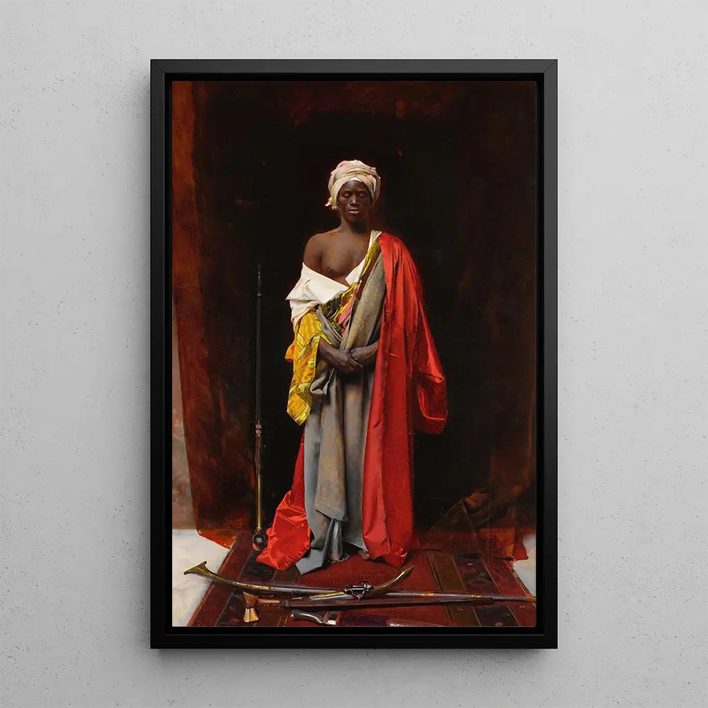 Ltaidegrafiikka "Une consécration des armes" de George Seymour herättää kunnioituksen ja sankaruuden tunnelman. Rikkaat ja syvät värit, jotka sekoittuvat punaisen ja kullan sävyihin, luovat vaikuttavan kontrastin, joka vangitsee heti katseen. Seymour'n tekniikka, joka on kuvattu vaikuttavalla realismilla, mahdollistaa tunteen ja jännityksen kokemisen esitettyjen hahmojen osalta. Jokainen yksityiskohta, kiiltävät haarniskat ja päättäväiset ilmeet, lisäävät voimakasta visuaalista kerrontaa, upottaen katsojan sotilaallisen juhlan hetkeen. Tämä taulu on enemmän kuin pelkkä esitys; se on kutsu pohtia uhrauksen ja sankaruuden merkitystä.
