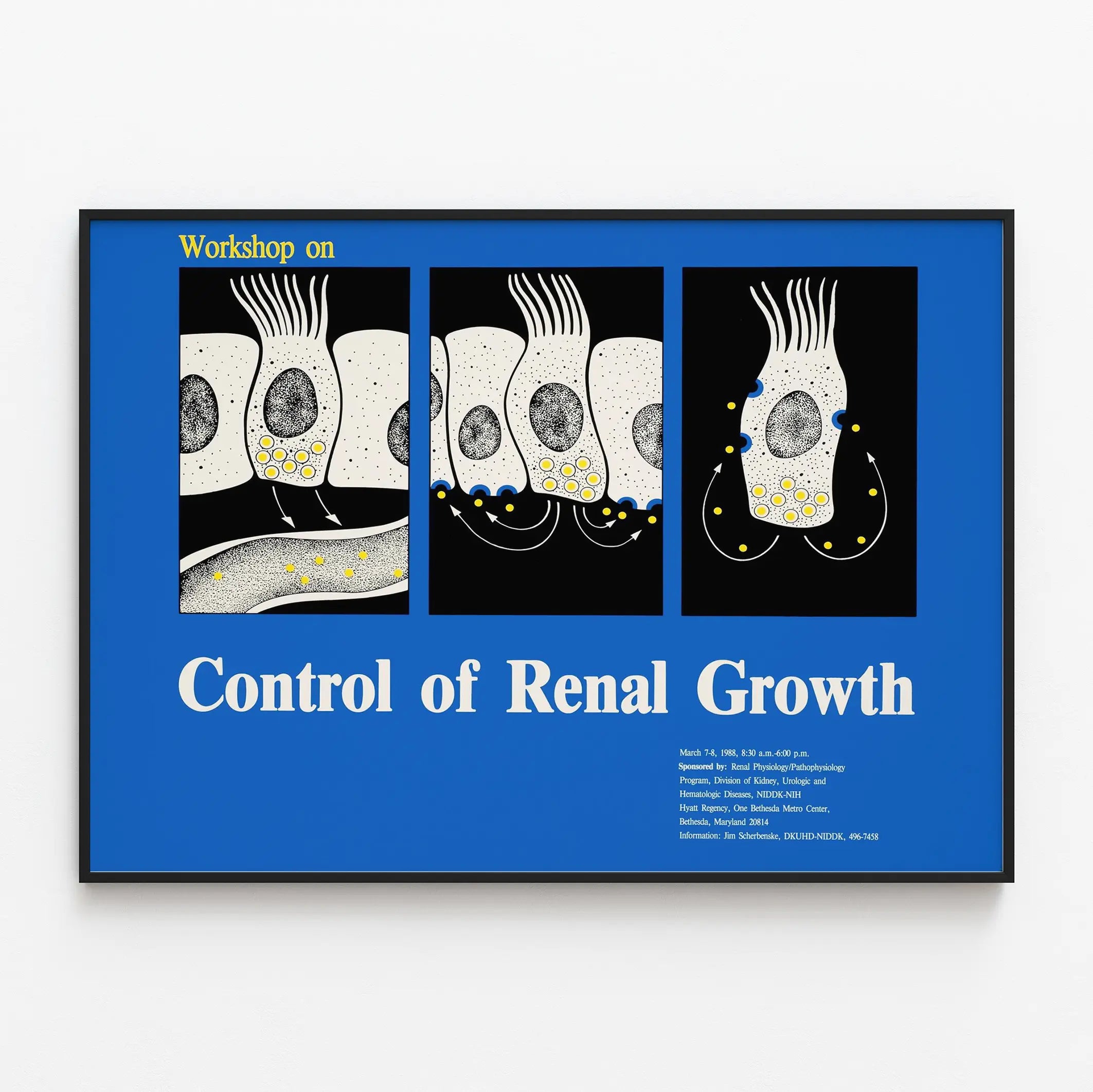 Tämä vintage juliste kuvaa tieteellistä työpajaa munuaiskasvun säätelystä, inspiroituneena biologisista kaavioista. Seinäsisustus sisältää kolme graafista paneelia, jotka esittävät soluja yksinkertaisella ja pisteytyksellä tehdyllä tyylillä, luoden sekä opettavaisen että taiteellisen estetiikan. Juliste käyttää intensiivistä sinistä taustaa, joka korostaa mustia, valkoisia ja keltaisia kuvituksia, tuoden modernin vivahteen samalla muistuttaen lääketieteen ja tieteiden maailmasta. Tämä juliste on erinomainen ainutlaatuiseen seinäkoristukseen, erityisesti tiloihin, jotka on omistettu tieteelle, lääketieteelle tai opetukselle. Selkeästi näkyvä teksti, klassisella valkoisella typografialla kirjoitettuna, ja linjakkaat kuvat korostavat tämän kappaleen informatiivista ja koristeellista luonnetta. Keskuskuvio viittaa solujen säätelyyn munuaisissa, mikä voi herättää kiinnostusta biologisiin tieteisiin ja lääketieteelliseen tutkimukseen. Olipa kyseessä toimisto, opiskeluhuone tai kirjasto, tämä juliste lisää älyllistä ja nykyaikaista eleganssia. Huolellisesti suunnitellun graafisen muotoilunsa ansiosta tämä juliste sopii täydellisesti moderniin ja epätavalliseen seinäkoristukseen, tarjoten taiteellisen näkemyksen monimutkaisesta tieteellisestä aiheesta.