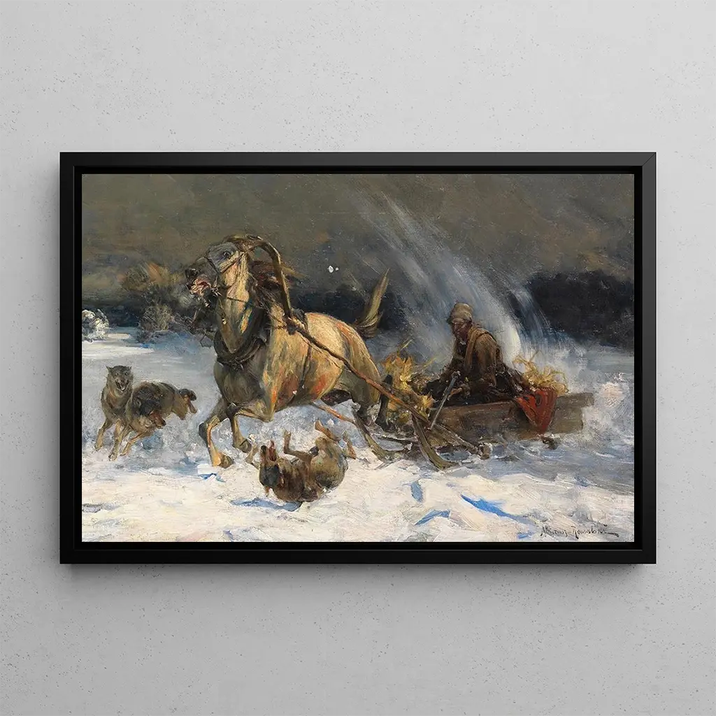 Alfred von Wierusz-Kowalski, né en 1849, est reconnu pour ses représentations saisissantes d'animaux sauvages, en particulier dans le contexte des paysages polonais. Influencé par le romantisme et le réalisme, il a su capturer la majesté et la brutalité de la faune. Sa carrière, marquée par des expositions à Paris et à Munich, lui a permis de se faire un nom dans le monde de l'art. "Attaque des loups" est l'une de ses œuvres les plus emblématiques, illustrant son talent pour dépeindre des scènes de chasse avec une intensité dramatique. Son œuvre témoigne d'une époque où la nature sauvage était à la fois source d'inspiration et d'appréhension.