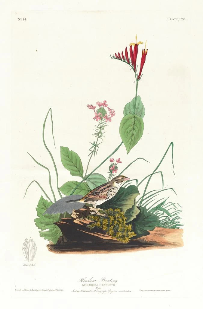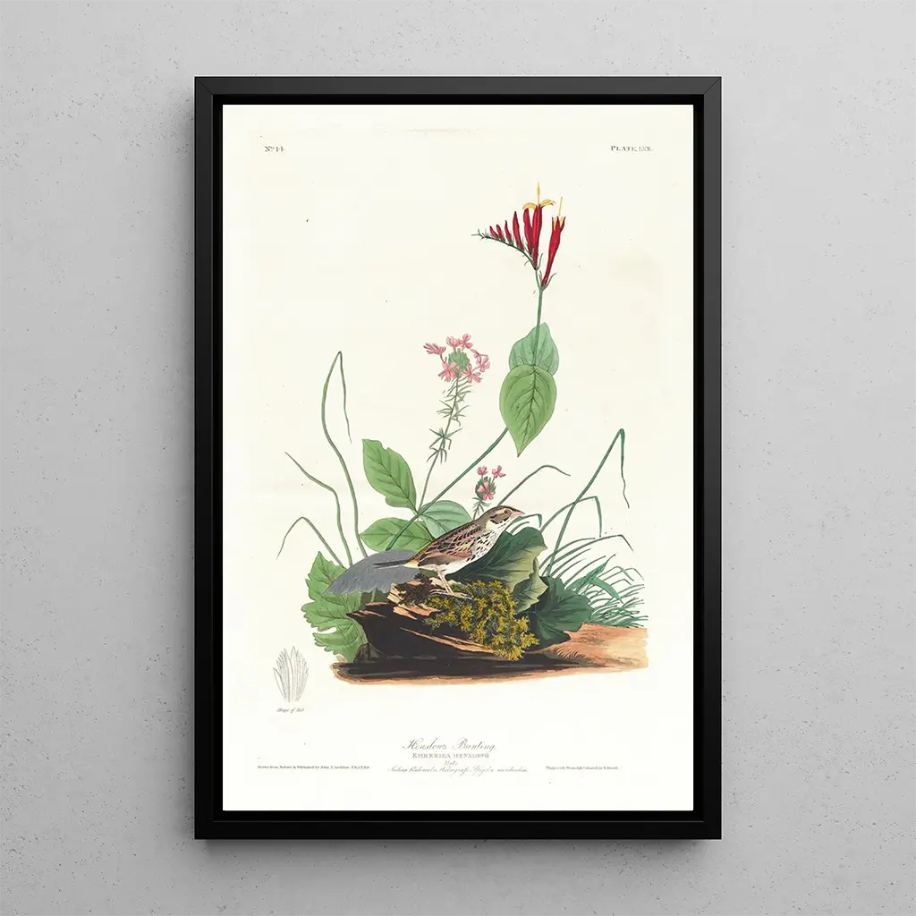 Le tableau "Bruant de Henslow" de John James Audubon est une œuvre vibrante qui capture la beauté délicate de cet oiseau. Avec des couleurs douces et naturelles, l'artiste utilise des nuances de vert, de jaune et de brun pour représenter le plumage du bruant, tandis que l'arrière-plan évoque un environnement serein, typique des prairies américaines. La technique précise d'Audubon, mêlant aquarelle et dessin, donne vie à chaque détail, créant une atmosphère à la fois réaliste et poétique. Cette œuvre invite à une contemplation attentive, révélant la grâce et la fragilité de la faune aviaire.