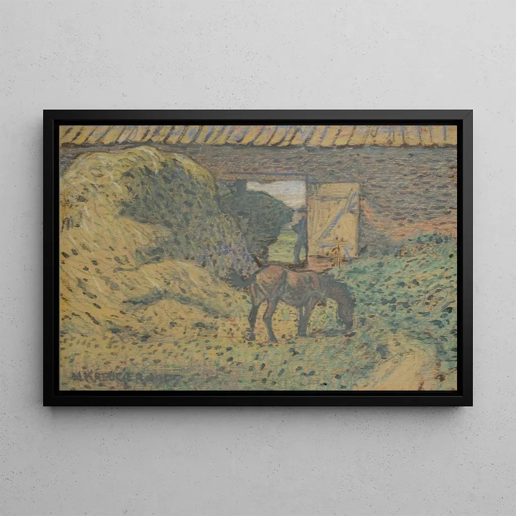 aito taidegrafiikka Au grenier à foin kuljettaa meidät maaseudun maisemaan, jossa auringon kultainen valo suodattuu puisten palkkien läpi. Tämä taidegrafiikka kuvaa maaseudun yksinkertaisuutta, jossa hahmot ovat mukana päivittäisissä askareissa. lämpimät ja maanläheiset värit, yhdistettynä vihreän sävyihin, luovat rauhoittavan ja lohdullisen tunnelman. Taiteilija onnistuu vangitsemaan hetken, joka on pysähtynyt aikaan, kutsuen katsojan uppoutumaan tähän rauhalliseen ja harmoniseen kohtaukseen.