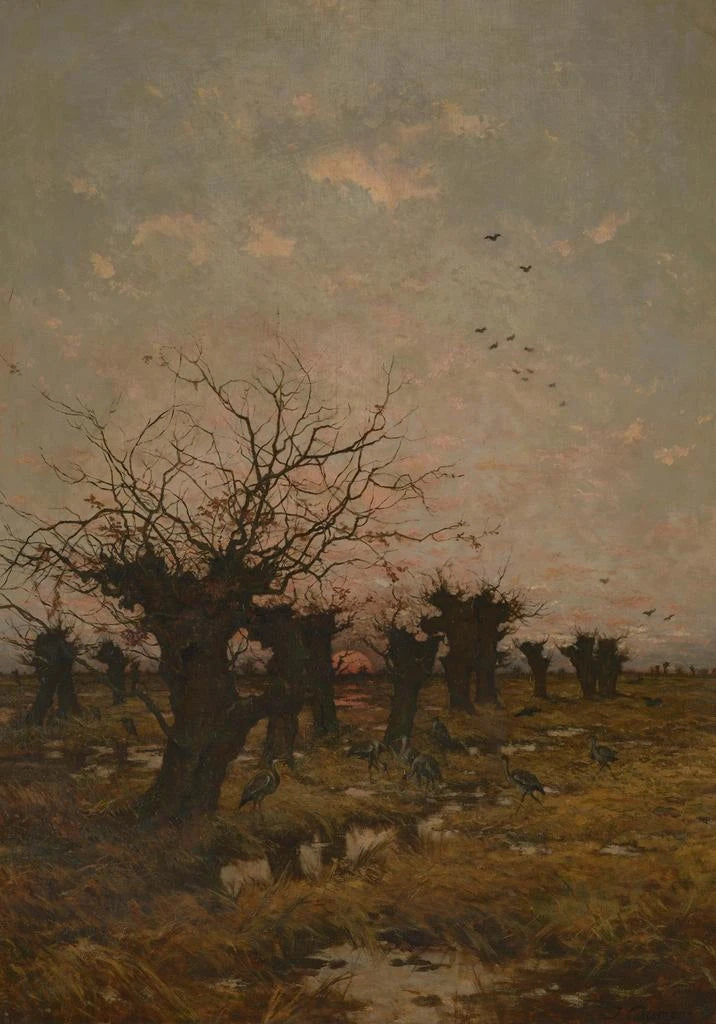 Le tableau "Coucher de soleil dans la Campine" de Joseph Théodore Coosemans nous plonge dans une scène paisible où les couleurs chaudes du crépuscule embrassent le paysage. Les nuances d'orange, de rose et de violet se mêlent avec délicatesse, créant une atmosphère sereine et contemplative. La technique de Coosemans, caractérisée par des coups de pinceau fluides et une attention méticuleuse aux détails, donne vie à la nature environnante. Les silhouettes des arbres se découpent sur ce fond flamboyant, invitant le spectateur à s'évader dans cette beauté éphémère. Ce tableau évoque une mélancolie douce, une invitation à savourer les instants fugaces de la vie.