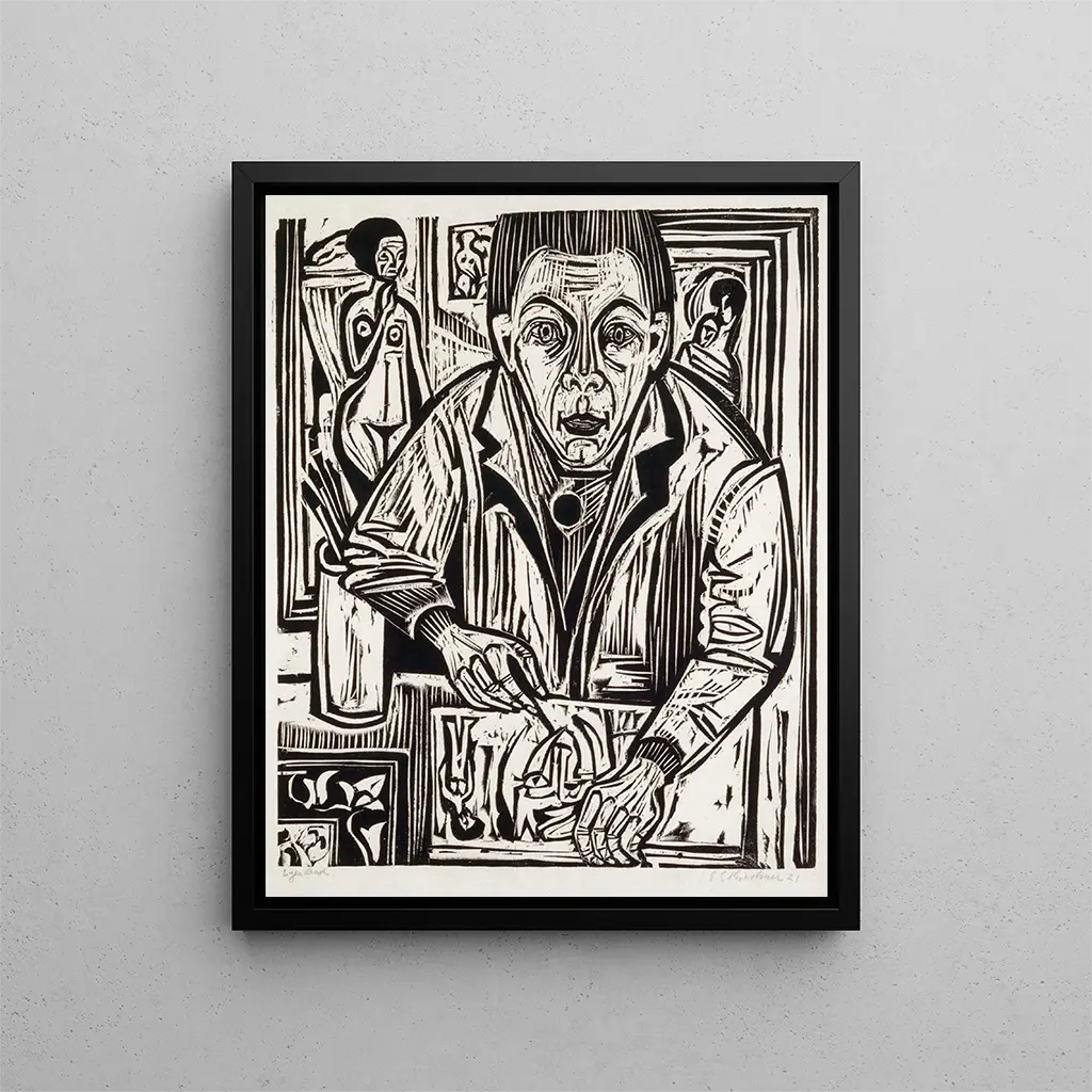 Taidetuloste Autoportrait gravé sur bois - Ernst Ludwig Kirchner – Houkutteleva johdanto Ernst Ludwig Kirchnerin teos "Autoportrait gravé sur bois" on mestariteos, joka ilmentää ekspressionismin ytimeen. Tässä teoksessa taiteilija syventyy syvälliseen introspektioon, vangiten ei vain kuvansa vaan myös mielenliikkeensä myrskyisyyden. Puu materiaalina tämän autoportraatin tukena kertoo halusta palata raakaan materiaaliin, viitaten taiteen ja aitouden ytimeen. Kirchner, joka oli Die Brücke -ryhmän perustajajäsen, on aina pyrkinyt ylittämään aikansa taiteelliset konventiot, ja tämä teos on koskettava esimerkki siitä. Se kutsuu katsojan sukeltamaan taiteilijan sisäiseen maailmaan, tuntemaan hänen sisällä vallitsevia tunteita ja löytämään hänen identiteettinsä monimutkaisuuden. Tyylin ja teoksen ainutlaatuisuuden Ernst Ludwig Kirchnerin tyyliä leimaa rohkeat linjat ja kirkkaat värit, jotka ovat ekspressionismin tunnusmerkkejä. "Autoportrait gravé sur bois" yhdistää nämä elementit luodakseen vaikuttavan ja häiritsevän kuvan. Puun käyttö kaiverrusmateriaalina antaa teokselle ainutlaatuisen tekstuurin, lisäten kosketeltavan ulottuvuuden, joka kutsuu tutkimaan. Kirchner leikkii varjoilla ja valolla, korostaen kasvonpiirteitä tavalla, joka vaikuttaa sekä realistiselta että tyylitellyltä. Tämä kaksijakoisuus vahvistaa teoksen viestiä: taiteilija on sekä tarkkailija että subjekti, mies, joka kamppailee omien demoneidensa kanssa, mutta myös totuuden etsijä. Kasvonpiirteiden, joskus kulmikkaiden, joskus pehmentyneiden, jäljet kertovat sisäisestä taistelusta, mikä tekee tästä teoksesta harvinaisen emotionaalisesti voimakkaan. Taiteilija ja hänen vaikutuksensa Ernst Ludwig Kirchner, saksalaisen ekspressionismin ikoni, on jättänyt jälkensä aikakauteensa innovatiivisella lähestymistavallaan maalaamiseen ja kaiverrukseen. Hän syntyi vuonna 1880 ja sai vaikutteita aikansa taiteellisista liikkeistä, samalla luoden oman tyylinsä. Kirchner tutki usein moderniutta, alistumista ja psyykkisiä ulottuvuuksia.