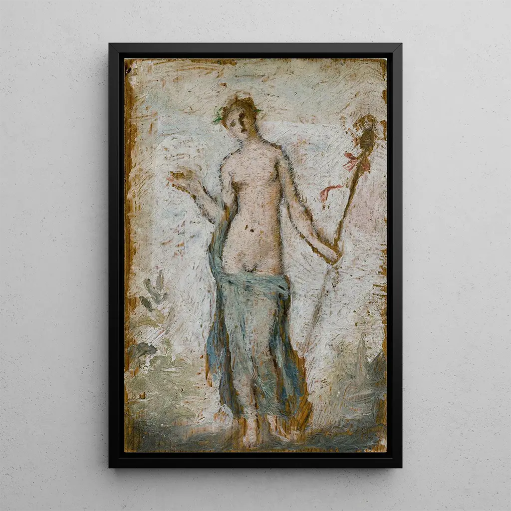 Bacchante au thyrse -taidegrafiikka johdattaa meidät juhlan ja aistillisuuden maailmaan. Tämä Henri Crosin luoma teos kuvaa iloista naisfiguuria, joka pitää thyrsea, viinin ja juhlinnan jumaluuden symbolia. Värien, syvän punaisen ja kirkkaan vihreän, eloisat sävyt luovat dynaamisen ja juhlavan ilmapiirin. Kipsiveistoksen tekniikka, jossa on hienovaraisia yksityiskohtia ja virtaviivaisia muotoja, herättää tämän bacchanten eloon, viitaten liikkeeseen ja energiaan. Teos kutsuu iloiseen pohdintaan, juhlii luontoa ja olemassaolon hurmioita.