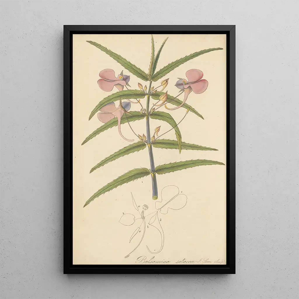 La taidegrafiikka "Balsamina setacea" William Jackson Hookerilta kuljettaa meidät eläväiseen ja värikkääseen kukkamaailmaan. Tämä teos korostaa balsamian ainutlaatuista kauneutta, sen herkkiä terälehtiä ja kirkkaita sävyjä, jotka näyttävät melkein sykähtelevän valon alla. Huolelliset yksityiskohdat, jotka ovat tyylin Hooker, paljastavat tämän kasvin monimutkaisuuden, kun taas kirkkaiden värien käyttö luo iloisen ja elävän ilmapiirin. Tämä taulu on todellinen luonnon juhla, joka kutsuu ihmettelemään ja mietiskelemään.