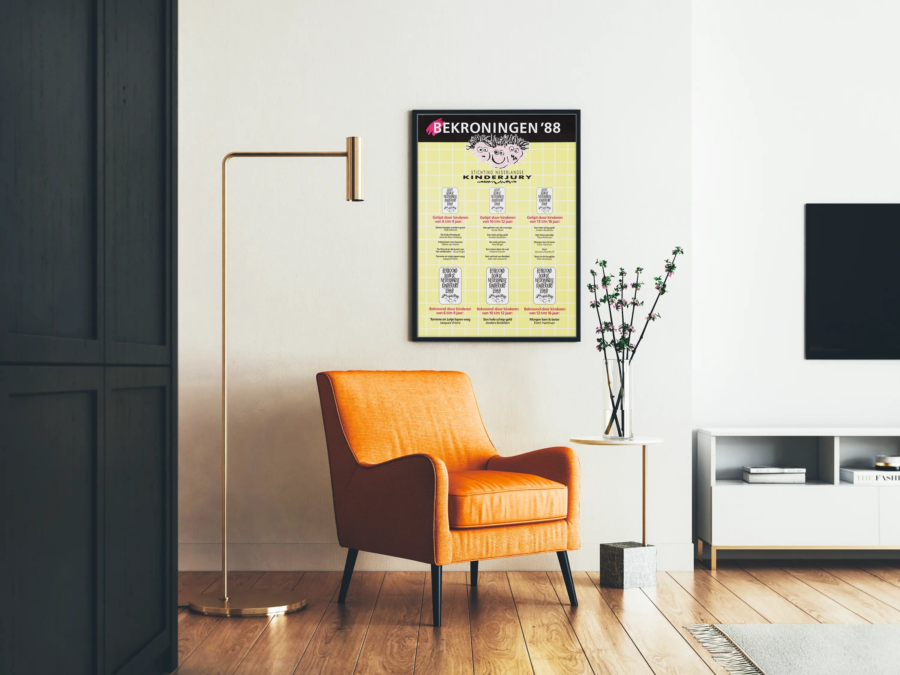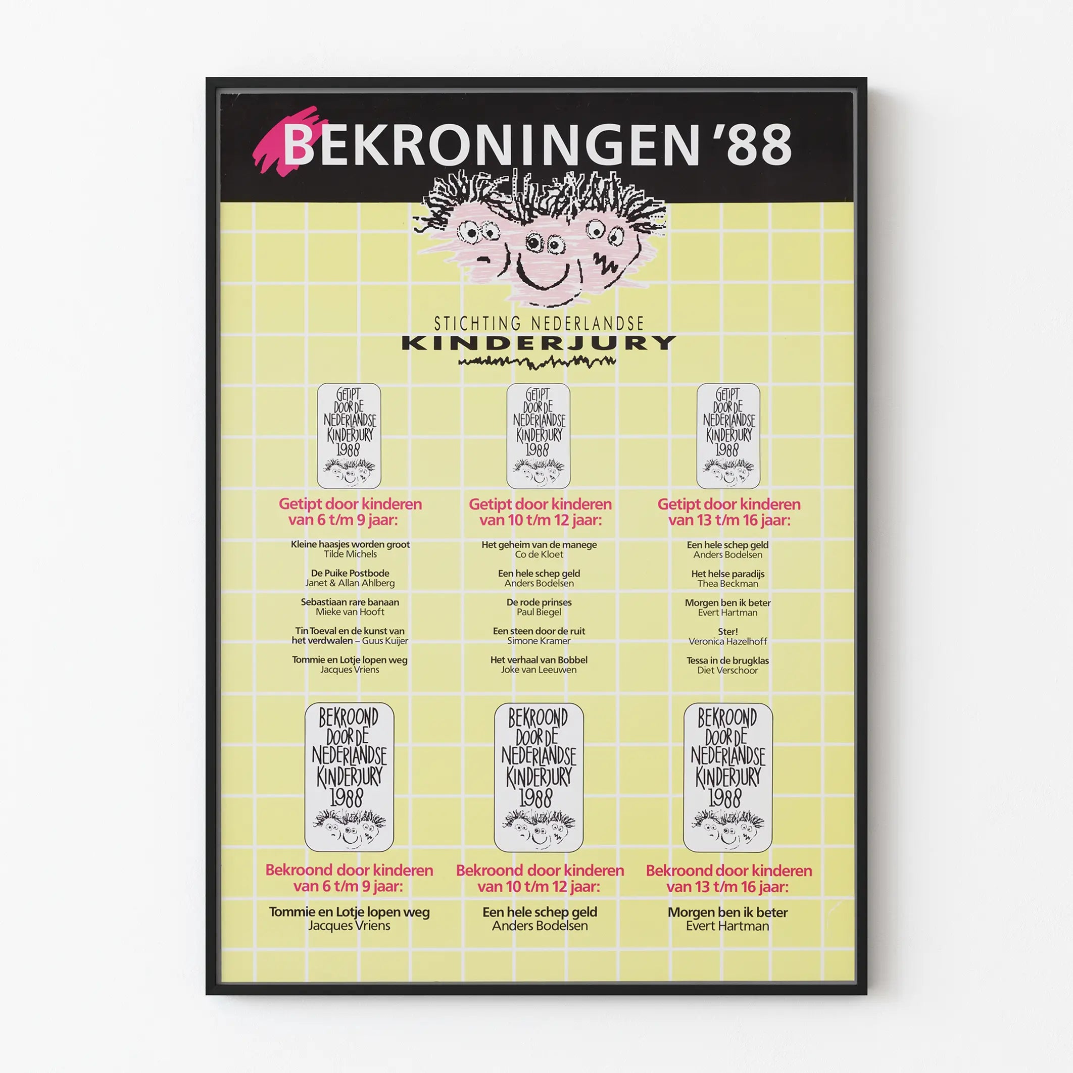 Löydä tämä alkuperäinen Bekroningen '88 -juliste, joka on tehty Stichting Nederlandse Kinderjury -järjestölle, lasten tuomaristolle Alankomaissa. Tämä juliste esittelee vuoden 1988 kirjallisuuden voittajat, jotka on valittu ja palkittu eri ikäryhmien lasten toimesta: 6–9 vuotta, 10–12 vuotta ja 13–16 vuotta. Graafinen koostumus erottuu vaaleankeltaisesta ruudukko-taustasta ja mustasta yläreunasta, jossa on näyttävä valkoinen kirjoitus, luoden tyyliltään retroilmeen 80-luvulta. Henkilökohtainen ja ilmeikäs lapsenomainen piirros kolmesta stilisoidusta kasvoista kiinnittää huomion keskellä, symboloiden todennäköisesti tämän palkinnon lapsenomaisuutta ja leikkisyyttä. Tämä seinäkoriste on täydellinen vintage-julisteiden harrastajille ja nuortenkirjallisuuden ystäville, tarjoten ainutlaatuisen kappaleen, joka liittyy palkittujen lasten kirjojen maailmaan. Julisteen eri osiot listavaat valitut teokset nuorten tuomarien mukaan, mikä tekee tästä julisteesta kulttuurisen todistuksen tästä ajasta. Ripusta tämä juliste sisätiloihin tuoden ripauksen retroa ja alkuperäistä tunnelmaa, mikä sopii erinomaisesti lasten huoneeseen, toimistoon tai kirjastoon. Jokainen typografinen ja visuaalinen yksityiskohta auttaa kertomaan Kinderjuryn tarinan, joka korostaa nuorten lukemisen harrastusta. Tämä Bekroningen '88 -juliste on siis taidetta, joka kantaa rikkaan lasten kirjallisuuden historian mukanaan, ja se sopii täydellisesti 1980-luvun graafisen taiteen kokoelmiin tai vintage-teemaisiin sisustuksiin. Yhteenvetona tämä juliste on erinomainen valinta niille, jotka haluavat tuoda sisätiloihinsa värikästä, kulttuurista ja nostalgista tunnelmaa.