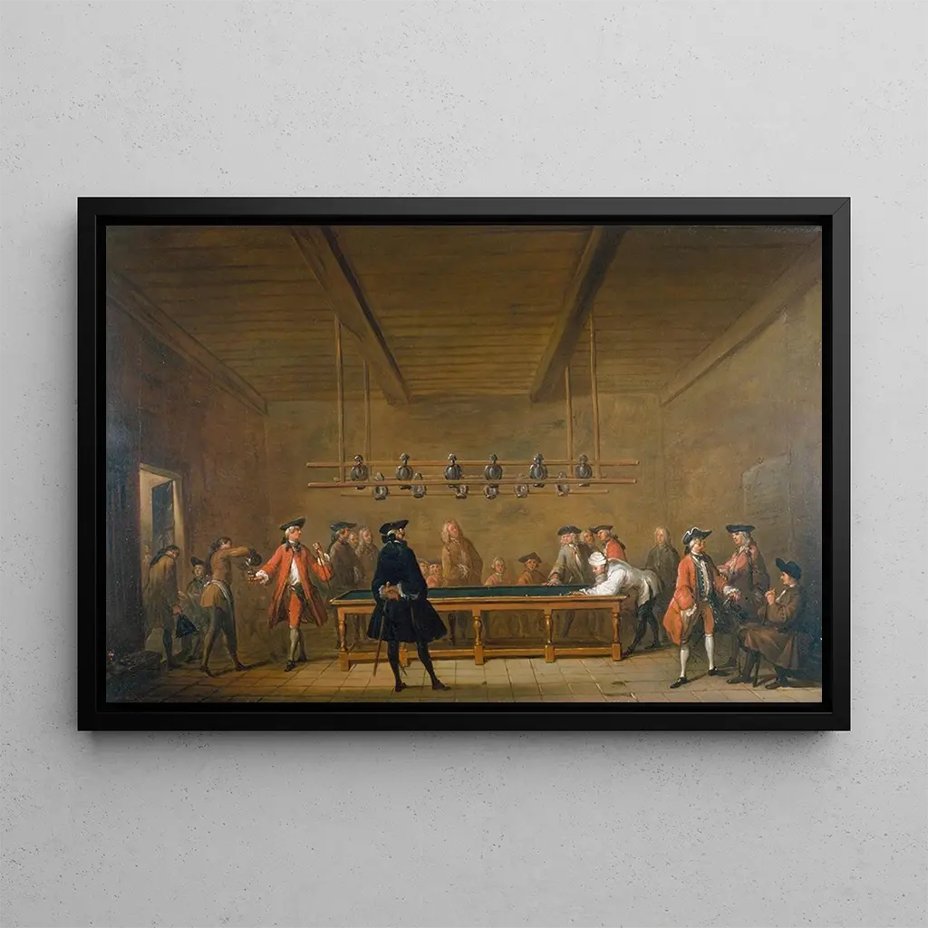 La Partie de billard, iconisch werk van Jean Siméon Chardin, dompelt ons onder in een intieme scène waar spel en contemplatie samenkomen. De compositie is zorgvuldig georkestreerd, met de nadruk op personages die verdiept zijn in hun activiteit. De warme, aardse kleuren, typerend voor de stijl van Chardin, creëren een gezellige en warme sfeer. Het zachte licht verlicht subtiel de gezichten, waardoor de intensiteit van het moment wordt versterkt. Dit doek, vervaardigd met een beheersde olieverftechniek, nodigt de kijker uit om zich te verdiepen in dit moment van delen en gezelligheid, waarin elk detail een verhaal vertelt.