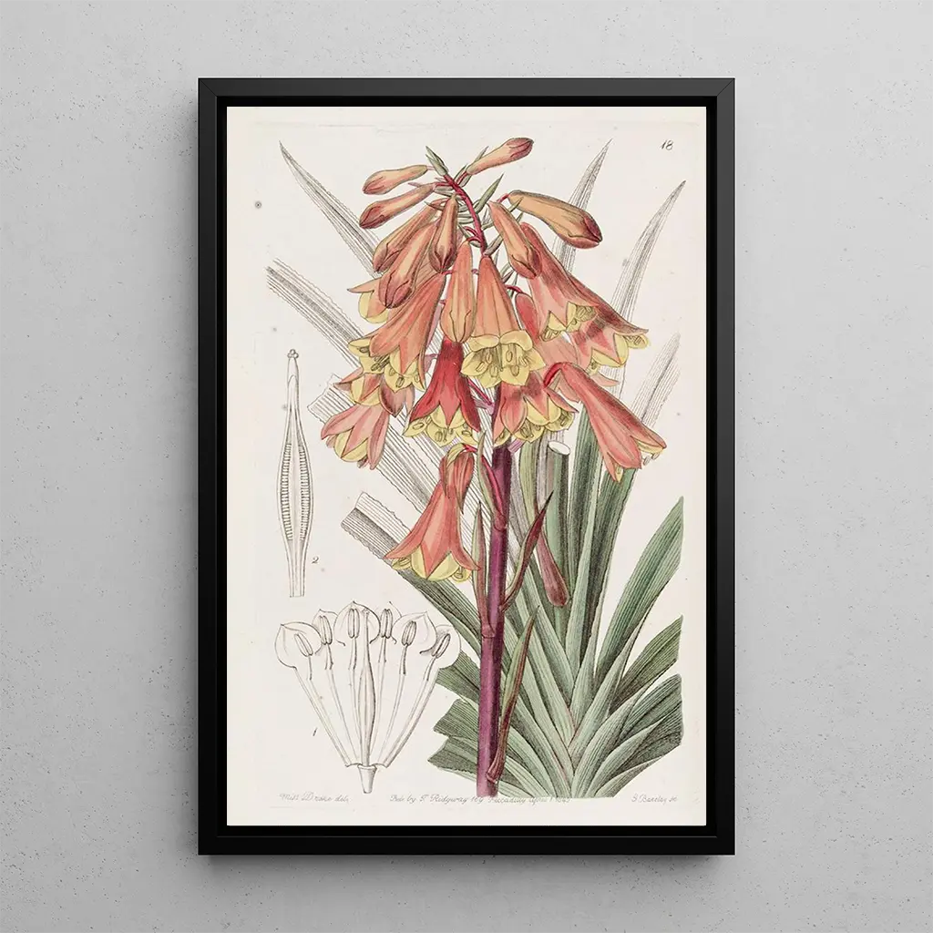 Taidegrafiikka Blandfordia karkealla karkealla paljastaa hienostuneen koostumuksen, jossa punaisen ja vihreän sävyt sekoittuvat harmonisesti. Tämä teos, joka on toteutettu huolellisella tarkkuudella, korostaa tämän australialaisen kasvin ainutlaatuista kauneutta. Terälehtien ja lehtien yksityiskohdat, jotka on tehty huolellisesti, luovat rauhan ja ihailun ilmapiirin. Akvarellitekniikka, jota käyttää Sydenham Edwards, mahdollistaa valon ja tekstuurin vangitsemisen, tarjoten immersiivisen visuaalisen kokemuksen.