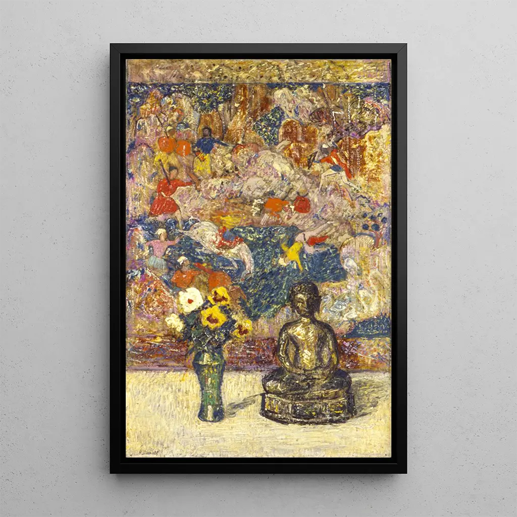 Bouddha en bronze : une sculpture empreinte de sérénité La taidegrafiikka du Bouddha en bronze, œuvre emblématique, évoque une atmosphère de paix et de méditation. La finesse des détails, des traits du visage aux plis de la robe, témoigne d'un savoir-faire exceptionnel. Les nuances de bronze, patinées par le temps, ajoutent une profondeur visuelle qui invite à la contemplation. Cette sculpture, à la fois majestueuse et apaisante, semble capturer l'essence même de la sagesse bouddhiste, offrant un refuge spirituel à ceux qui l'observent. L'éclat doux du métal, associé à une pose sereine, crée une ambiance propice à la réflexion et à l'harmonie intérieure. Henry Golden Dearth : un maître de la sculpture religieuse Henry Golden Dearth, sculpteur américain du début du XXe siècle, a su marier tradition et innovation dans ses œuvres. Influencé par l'art asiatique et les philosophies orientales, il a consacré sa carrière à la création de sculptures qui célèbrent la spiritualité. Son style, à la fois réaliste et stylisé, reflète une quête de transcendance, cherchant à représenter des figures sacrées avec une profondeur émotionnelle. Le Bouddha en bronze est l'un de ses chefs-d'œuvre, illustrant son engagement envers l'art sacré et son désir de partager des messages de paix et de sagesse à travers ses créations. Une acquisition décorative aux multiples atouts La taidegrafiikka du Bouddha en bronze est une pièce décorative idéale pour divers espaces, qu'il s'agisse d'un salon, d'un bureau ou d'une chambre. Sa présence imposante et sereine apporte une touche d'élégance et de spiritualité à votre intérieur. Fabriquée avec soin, cette toile respecte les détails et la qualité de l'œuvre originale, garantissant une fidélité exceptionnelle. Son attrait esthétique, allié à ses connotations spirituelles, en fait un choix parfait pour ceux qui cherchent à enrichir leur décor tout en cultivant une atmosphère de calme et de réflexion.