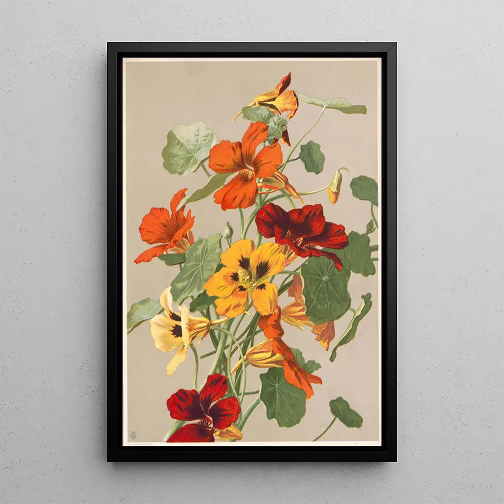 Capucines, niiden eloisilla sävyillä ja herkkyydellään, kukoistavat tässä Louis Prang Co:n taidegrafiikassa. Kukka-asetelma on todellinen värien festivaali, jossa punainen, oranssi ja keltainen kietoutuvat toisiinsa luoden iloisen ja elävän ilmapiirin. Taiteilijan tekniikka, joka yhdistää litografian ja värilithografian, mahdollistaa jokaisen terälehden kirkkaan tarkasti jäljentämisen. Tämä taidegrafiikan reproduktio kutsuu rauhoittavaan pohdintaan, jossa luonnon kauneus korostuu, tarjoten hetken rauhaa ja tyyneyttä niille, jotka sitä ihailevat.
