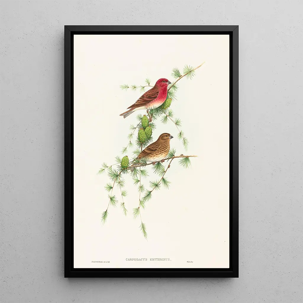 L reproduktio Carpodacus erythrinus, jonka on tehnyt John Gould, vangitsee poikkeuksellisella tarkkuudella tämän pienen linnun loiston. Sen kirkkaat höyhenvärit, jotka vaihtelevat punaisen ja ruskean välillä, herättävät mielikuvan luonnon keskellä vietetystä kesästä. Gould, jonka taito lintujen kuvittajana on vertaansa vailla, käyttää vesiväritekniikoita, jotka herättävät eloon jokaisen yksityiskohdan, hienoista höyhenistä hienovaraisiin sävyihin. Tämän teoksen tunnelma kutsuu ihmetykseen, kuljettaen katsojan maailmaan, jossa luontoa juhlitaan monimuotoisuudessaan.
