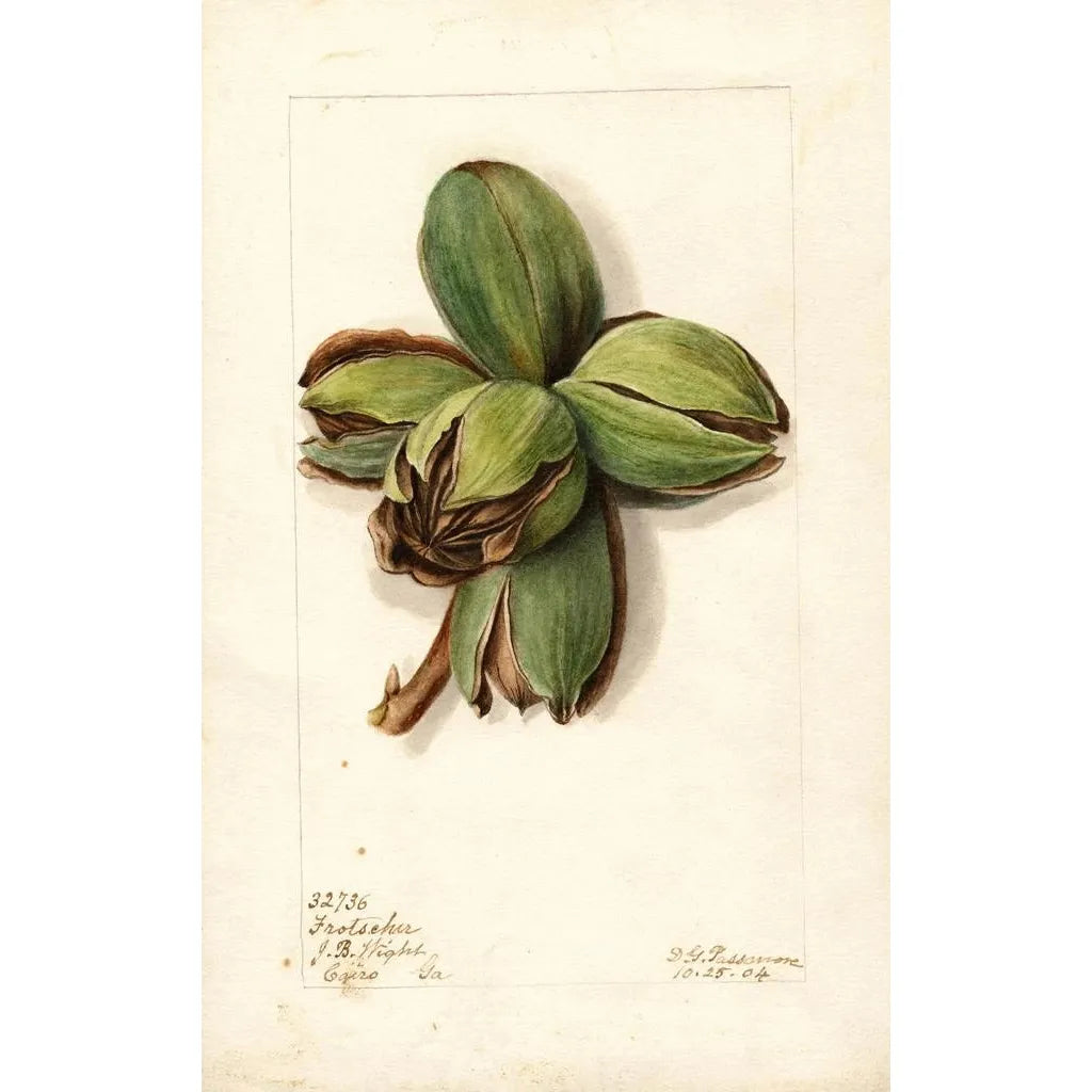 Deborah Griscom Passmoren taidegrafiikka Carya Frotscher on luonnonkauneuden juhla, jossa vihreän sävyt sekoittuvat ruskean ja kullan vivahteisiin. Tämä teos, toteutettu hienostuneella vesiväritekniikalla, herättää kuvan puiden majesteettisuuden ja kasviston rikkautta. Jokainen oksa, jokainen lehti on kuvattu niin hienovaraisesti, että se vaikuttaa värisevän tuulen huminassa. Kankaan yleinen tunnelma kutsuu rauhalliseen pohdintaan, kuljettaen katsojan rehevään puutarhaan, täynnä elämää ja värejä.
