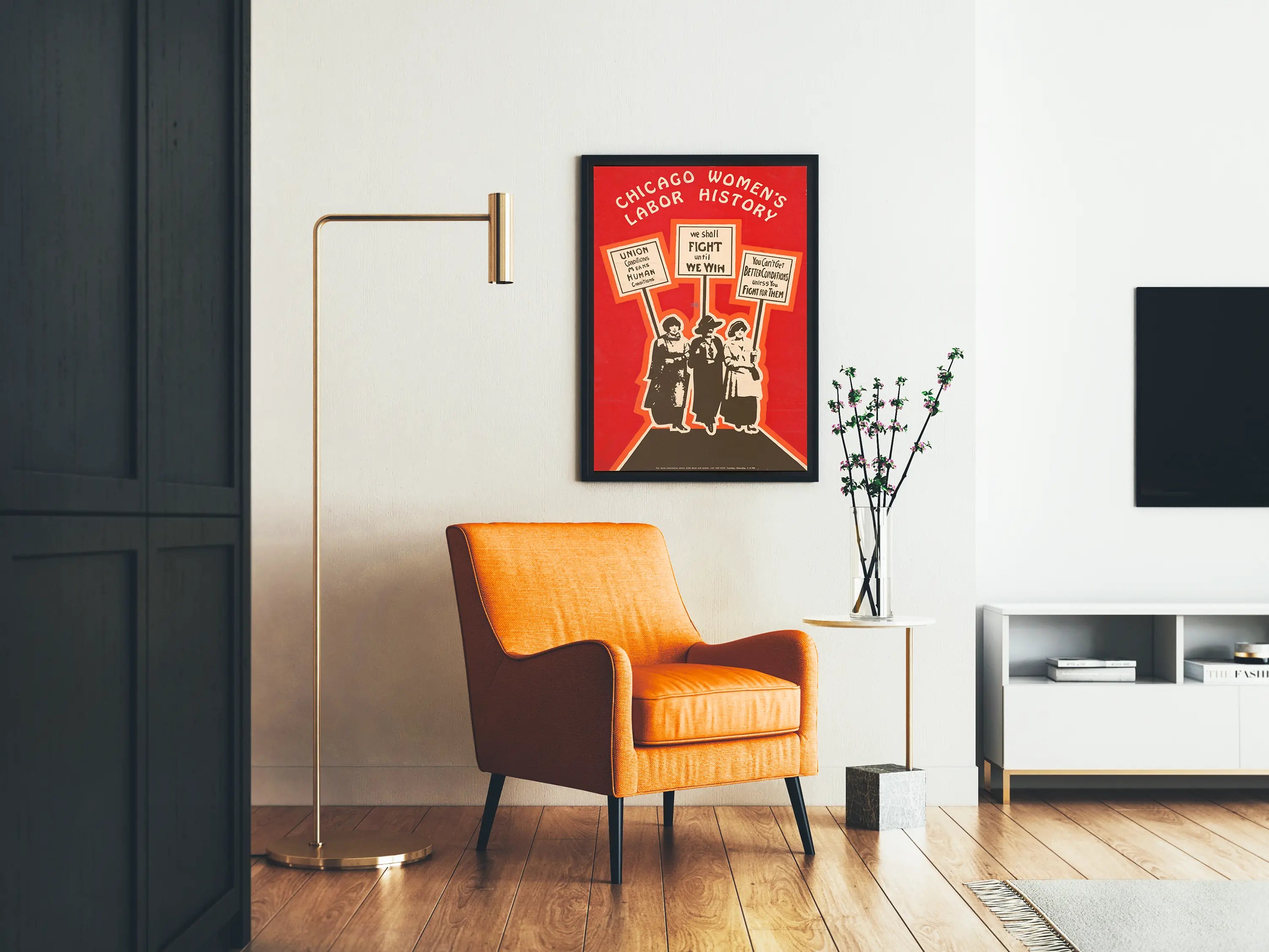 Tämä juliste nimeltä "Chicago Women's Labor History" on vaikuttava sitoutunut seinäkoriste, joka korostaa naisten taistelun historiaa työelämässä Chicagossa. Visuaalinen esitys esittelee kolme naista, jotka kantavat kylttejä voimakkain ja inspiroivin sloganein: «YHDISTYKSEN EHDOT TARKOITTAVAT IHMISEN EHDOT», «ME TAIEMME TAISTELLA, KUNNES VOITAMME», ja «ET VOI PARANTAA EHTOJA ILMAN TAISTELUA NIIDEN PUOLESTA». Kirkkaan punainen tausta korostaa tämän yhteiskunnallisen viestin kiireellisyyttä ja päättäväisyyttä. Tämä juliste, todellinen symboli työntekijöiden oikeuksien puolustamisesta, sopii täydellisesti sisustukseen, joka korostaa aktivistista, yhteiskunnallista ja historiallista tyyliä. Se sopii hyvin toimistoon, kokoushuoneeseen tai tilaan, joka on omistettu pohdinnalle ja yhteiskunnalliselle sitoutumiselle. Tämä seinäkoriste toimii sekä esteettisenä julisteena että viestin kantajana, ja se on ihanteellinen niille, jotka haluavat lisätä kotiinsa tietoisuutta historiasta ja feministisestä liikkeestä. Valitsemalla tämän julisteen arvostat paitsi merkittävää ajanjaksoa naisten työtaistelujen historiassa, myös vintage-suunnittelua, jonka tunnusmerkkejä ovat kontrastivärit ja yksinkertaiset muodot. Se on erinomainen valinta rikastuttamaan historiallisten julisteiden kokoelmaa tai inspiroimaan voimakkaasti inhimillistä ja aktivistista sisustusta. Tämä juliste kiinnittää huomion ja kutsuu keskusteluun, samalla vahvistaen vahvaa identiteettiä graafisen koostumuksensa ja vaikuttavien sloganeidensa kautta.