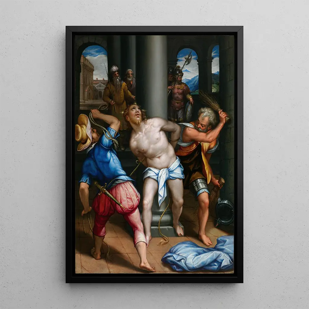 Denys Calvaert, 1500-luvulla aktiivinen belgi-taiteilija, osasi yhdistää italialaiset ja flaamintyyppiset vaikutteet teoksiinsa. Hän kouluttautui Bolognassa ja oli vaikuttunut renessanssin suurmestareista, mikä näkyy hänen hienostuneessa tekniikassaan ja visuaalisen kertomuksen taidossaan. Calvaertia pidetään usein barokin aikakauden edustajana, tyylinä, joka korostaa tunnetta ja liikettä. Hänen työnsä, vaikka ei olekaan yhtä tunnettu kuin hänen aikalaistensa, on jättänyt merkittävän jäljen taiteen historiaan, erityisesti kyvystään vangita jännityksen hetkiä, kuten tämä Christ à the colonne -taidegrafiikka osoittaa.