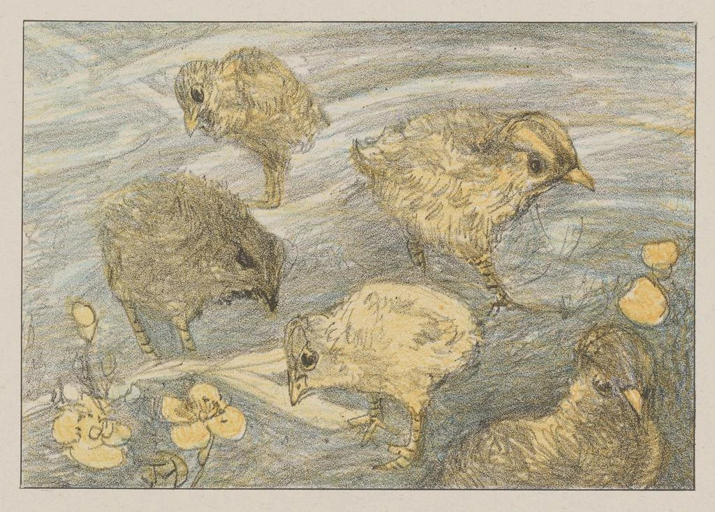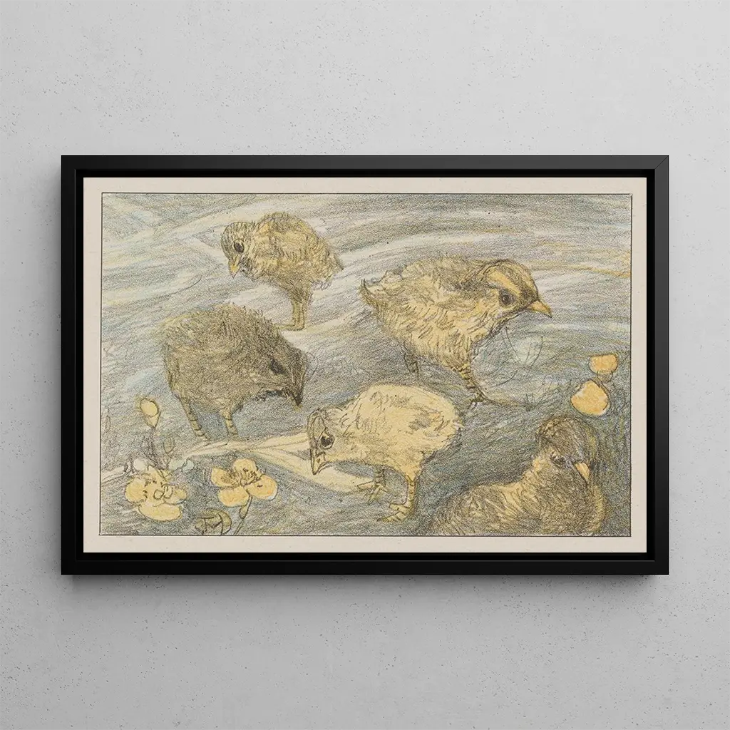 Dans cette œuvre délicate, Theo van Hoytema capture l'innocence et la curiosité des jeunes poussins. La composition, subtilement équilibrée, met en avant les petites créatures aux plumes duveteuses, baignées dans une lumière douce et chaleureuse. Les teintes pastel, allant du jaune pâle au beige, créent une atmosphère apaisante, presque onirique. La technique de l'aquarelle, utilisée avec finesse, permet de rendre les textures délicates des plumes et de la terre, tout en insufflant une vie vibrante à ces petits êtres. Cette reproduction de "Cinq poussins" invite à une contemplation sereine, évoquant la beauté simple de la nature.
