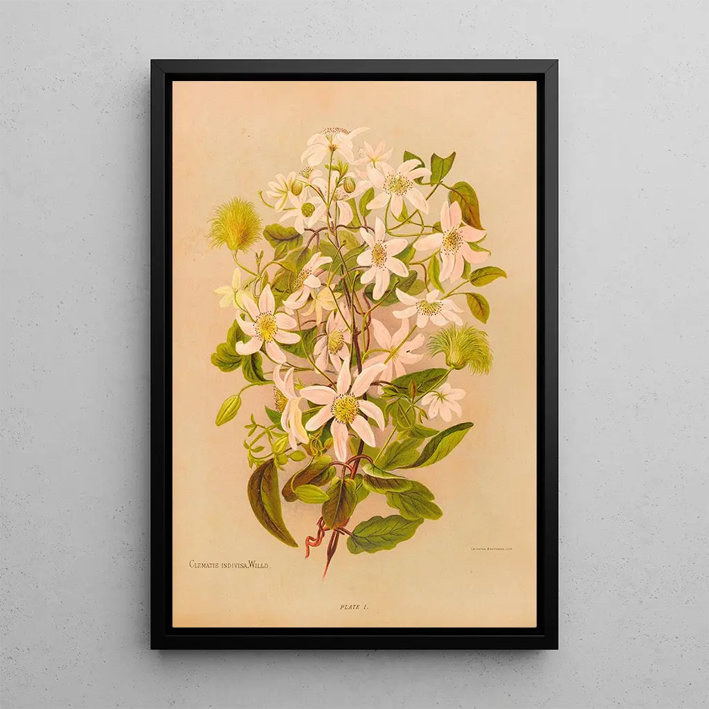 Clematis indivisa, Georgina Burne Hetleyn teos, kuvaa herkkää kukkivaa tanssia, jossa terälehdet kietoutuvat kauniisti toisiinsa. Kompositio on todellinen kunnianosoitus luonnolle, vangiten tämän köynnöskasvin olemuksen. Elävät värit ja hienovaraiset vihreän ja violetin sävyt luovat elävän ja iloisen tunnelman. Vesiväritekniikka, sen sulavien sävyjen kanssa, mahdollistaa kukkien keveyden tuntemisen, melkein kuin ne leijuisivat kankaalla. Tämä taidegrafiikka kutsuu mietiskelyyn, pakoon vehreään puutarhaan, jossa jokainen yksityiskohta on huolellisesti esillä.