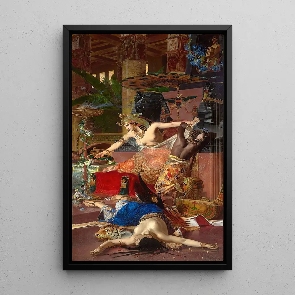Cléopâtre, historian ikoni, on täällä upeasti ikuistettu Julius Kronbergin toimesta. Tässä teoksessa taiteilija kuvaa egyptiläiskuningattaren arvoituksellisella ja majesteettisella tavalla. Rikkaat värit ja yksityiskohtaiset koristeet korostavat hänen kuninkaallista asemaansa, kun taas hänen ilmeensä heijastaa sekä viisautta että viettelyä. Kompositio, tasapainoinen ja harmoninen, vie katsojan muinaisen Egyptin kiehtovaan maailmaan, jossa kauneus ja valta sekoittuvat ajattomaan balettiin.