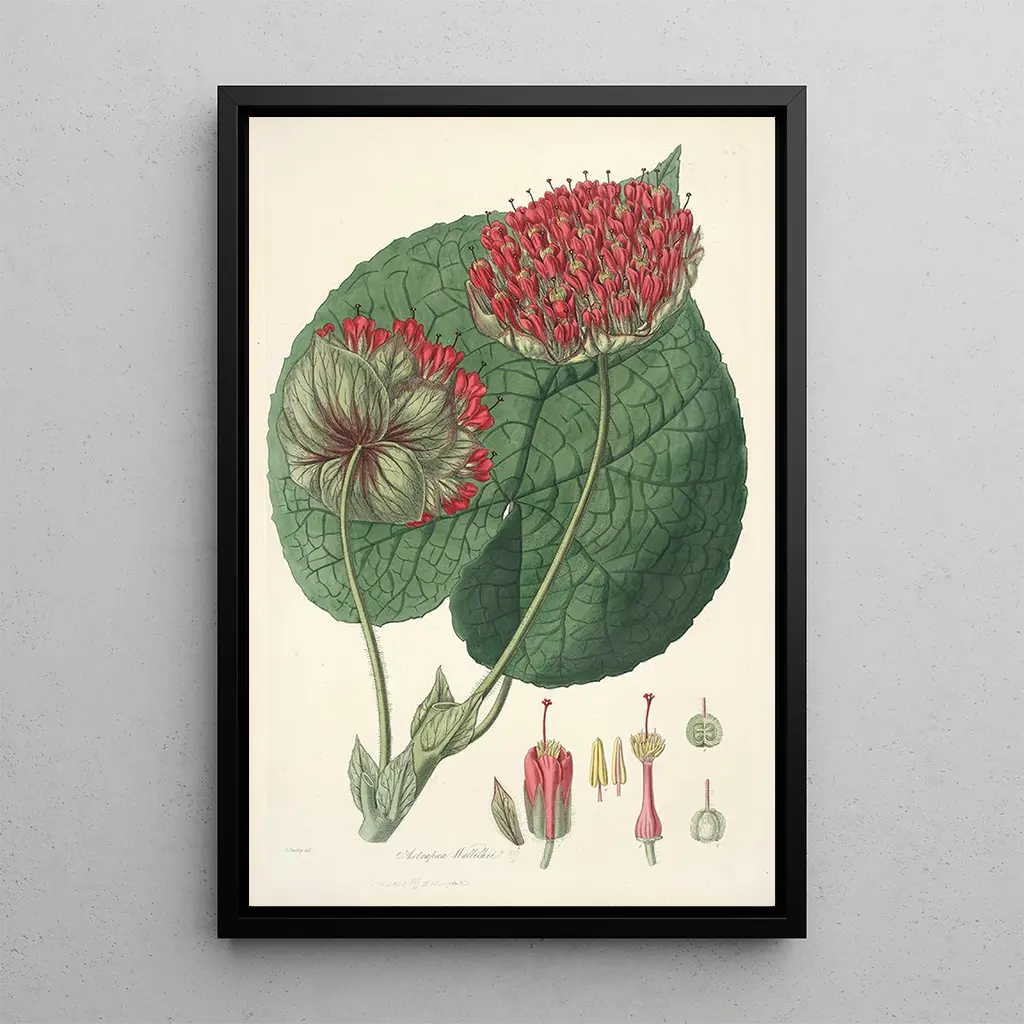 Taidegrafiikka Collectanea botanica Pl14 vie meidät värikkääseen ja yksityiskohtaiseen maailmaan. Jokainen kasvi on esitetty poikkeuksellisella tarkkuudella, korostaen luonnon kauneutta ja monimutkaisuutta. Kukkien kirkkaat sävyt kontrastoivat lehtien pehmeämpien sävyjen kanssa, luoden visuaalisen harmonian, joka houkuttelee katseen. John Lindleyn käyttämä kaiverrustekniikka mahdollistaa herkän tekstuurin tallentamisen terälehdistä ja varresta, luoden sekä tieteellisen että runollisen tunnelman. Tämä taidegrafiikka on todellinen kutsu tutkia biodiversiteettiä ja arvostaa kasvilajin loistoa.