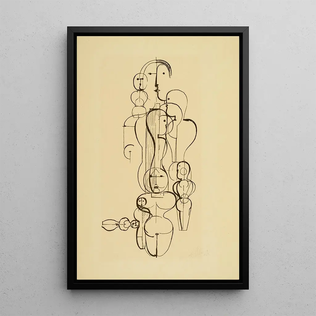Kohteessa "Plan de groupe concentrique K1" Oskar Schlemmer kutsuu meidät tutkimaan universumia, jossa geometriset muodot kietoutuvat toisiinsa kiehtovassa visuaalisessa harmoniassa. Ympyrät, kolmio ja suorakulmiot lomittuvat, luoden dynaamisen koostumuksen, joka näyttää värien elävöittämältä vaikutuksen alla. Schlemmerin tekniikka, joka yhdistää maalausta ja abstraktiota, luo sekä leikkisän että pohdiskelevan ilmapiirin, jossa jokainen elementti löytää paikkansa visuaalisessa baletissa. Tämä taidegrafiikka, todellinen kunnianosoitus moderniudelle, johdattaa meidät pohdintaan tilasta ja liikkeestä, ylittäen pelkät muodot ja viitaten kollektiiviseen tanssiin.