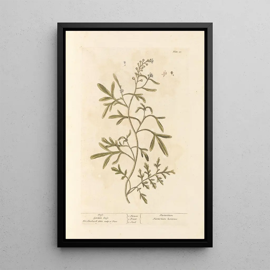 Cresson : kauniin luonnon ylistys Tässä Elizabeth Blackwellin taidegrafiikka Cressonista, hän kuljettaa meidät eloisaan ja herkkään luontoon. Kankaassa korostuvat vihreän sävyt, jotka viittaavat jokien ja puutarhojen raikkauteen. Lehtien ja kukkien yksityiskohtainen kuvaus osoittaa tarkkaa havainnointia ja hienostunutta kaiverrustekniikkaa. Tämän teoksen välittämä tunnelma on rauhoittava, kutsuen katsojan arvostamaan tämän vesikasvin yksinkertaista mutta olennaista kauneutta. Jokainen elementti on huolellisesti aseteltu, luoden harmonisen kokonaisuuden, joka juhlistaa kasviston rikkautta. Elizabeth Blackwell : L kasvinveiston pioneeri Elizabeth Blackwell, 1700-luvulla aktiivinen, on ikoninen hahmo L kasvinveistossa. Hän syntyi vuonna 1707 ja osasi yhdistää taiteen ja tieteen, ollen ensimmäinen nainen, joka julkaisi L kasvinveistön kirjan Englannissa. Hänen työnsä ajoittuu aikaan, jolloin kasvien tutkimus oli kukoistuksessaan, ja sitä vaikutti hänen aikansa tieteelliset löydöt. Blackwell sai inspiraationsa kasvitieteilijöiltä kuten Carl Linnaeus, ja hänen tarkka lähestymistapansa kunnioittaa kasvilajin kauneutta ja monimuotoisuutta. Hänen perintönsä jatkuu, tehden hänestä pioneerinsa alallaan. Monipuolinen koristeellinen hankinta Valitsemalla Elizabeth Blackwellin taidegrafiikan Cressonista, valitset teoksen, joka kaunistaa sisustustasi ja tuo luonnon kosketuksen. Olipa kyseessä olohuone, toimisto tai makuuhuone, tämä taidegrafiikka sopii harmonisesti erilaisiin sisustustyyleihin. Tulostuksen laatu takaa alkuperäisten yksityiskohtien uskollisuuden, jolloin voit tuntea teoksen hienovaraisuuden. Sen esteettinen vetovoima tekee siitä keskipisteen, herättää uteliaisuutta ja ihailua vieraissasi, samalla luoden rauhallisen ja inspiroivan ilmapiirin asuintilaasi.