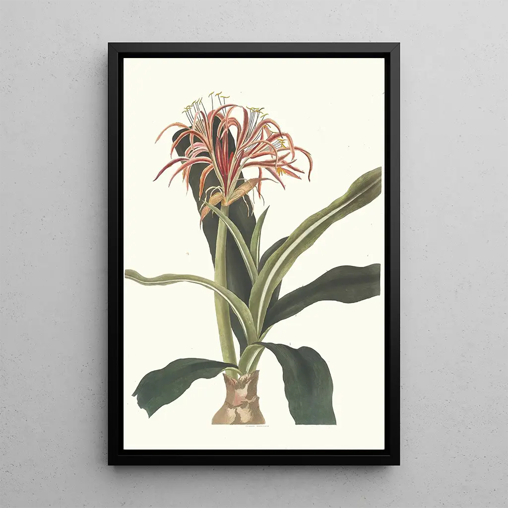 Taidegrafiikka Crinum Hybridum Pedunculatum et Zeylanicum johdattaa meidät kukkivaan maailmaan, jossa kirkkaat värit kietoutuvat kauniisti yhteen. Vihreän ja vaaleanpunaisen sävyt, loistavat ja säteilevät, herättävät trooppisten puutarhojen raikkauden. Priscilla Susan Buryn käyttämä vesiväritekniikka antaa tälle kankaalle keveyttä ja läpinäkyvyyttä, jotka vangitsevat kukkien olemuksen. Tämän teoksen tunnelma on sekä rauhoittava että inspiroiva, kutsuen katsojan pakomatkalle maailmaan, jossa luonto hallitsee.