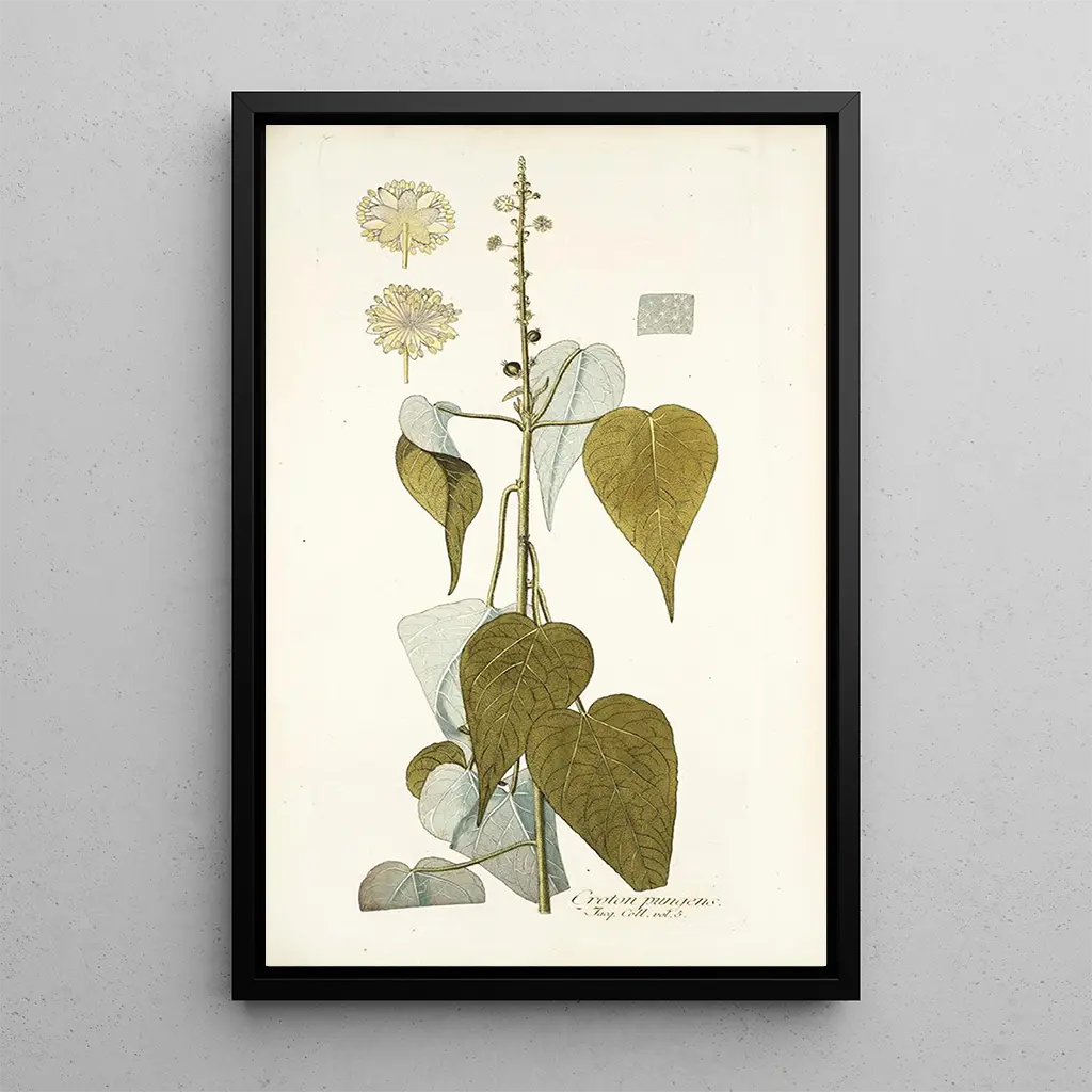 Croton pungens -taidegrafiikka paljastaa kiehtovan kasvitieteellisen koostelman, jossa kirkkaanvihreän sävyt sekoittuvat keltaisen ja oranssin vivahteisiin. Vesiväritekniikka, jota käyttää Nikolaus Joseph Freiherr von Jacquin, mahdollistaa lehtien ja varren hienovaraisuuden vangitsemisen, luoden elävän ja dynaamisen ilmapiirin. Jokainen yksityiskohta, lehtien suonitus ja varren tekstuuri, on esitetty tarkkuudella, joka kutsuu tarkkaavaiseen havainnointiin. Tämä teos, sekä tieteellinen että taiteellinen, kuljettaa meidät vehreään maailmaan, jossa trooppisen kasviston kauneus pääsee oikeuksiinsa.