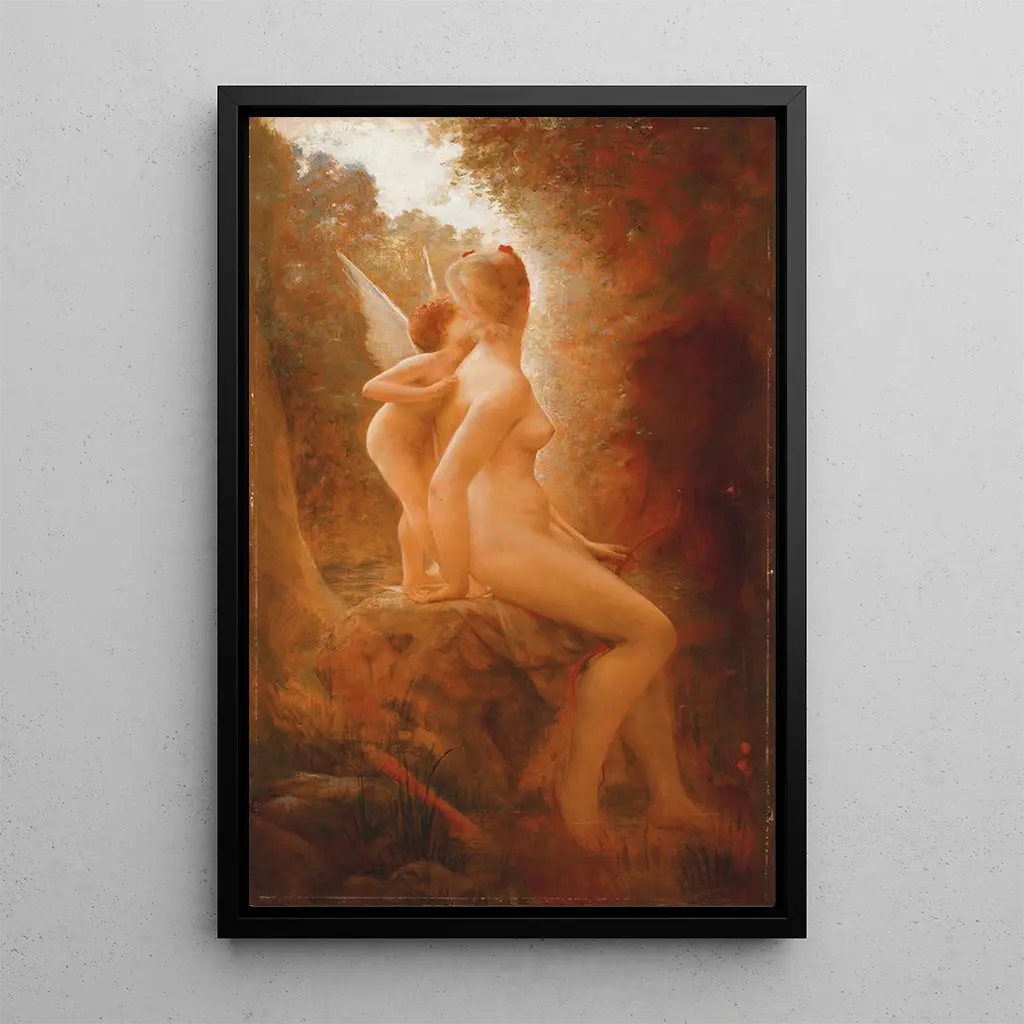 Taidegrafiikka "Cupidon et Psyché" -teoksesta Charles Auguste Sellier vie meidät intohimon ja mysteerin maailmaan. Tämä ikoninen teos kuvaa rakkauden ja sielun kohtaamista, esitettynä Cupidon ja Psychén kautta. Pehmeät värit ja hienostuneet yksityiskohdat luovat romanttisen tunnelman, jossa jokainen elementti vaikuttaa kertovan ikuisen rakkauden tarinan. Kompositio, sen hienovaraisine kaarineen ja liikuttavine ilmeineen, kutsuu mietiskelyyn ja antaa katsojalle mahdollisuuden uppoutua tähän myyttiseen legendaan.