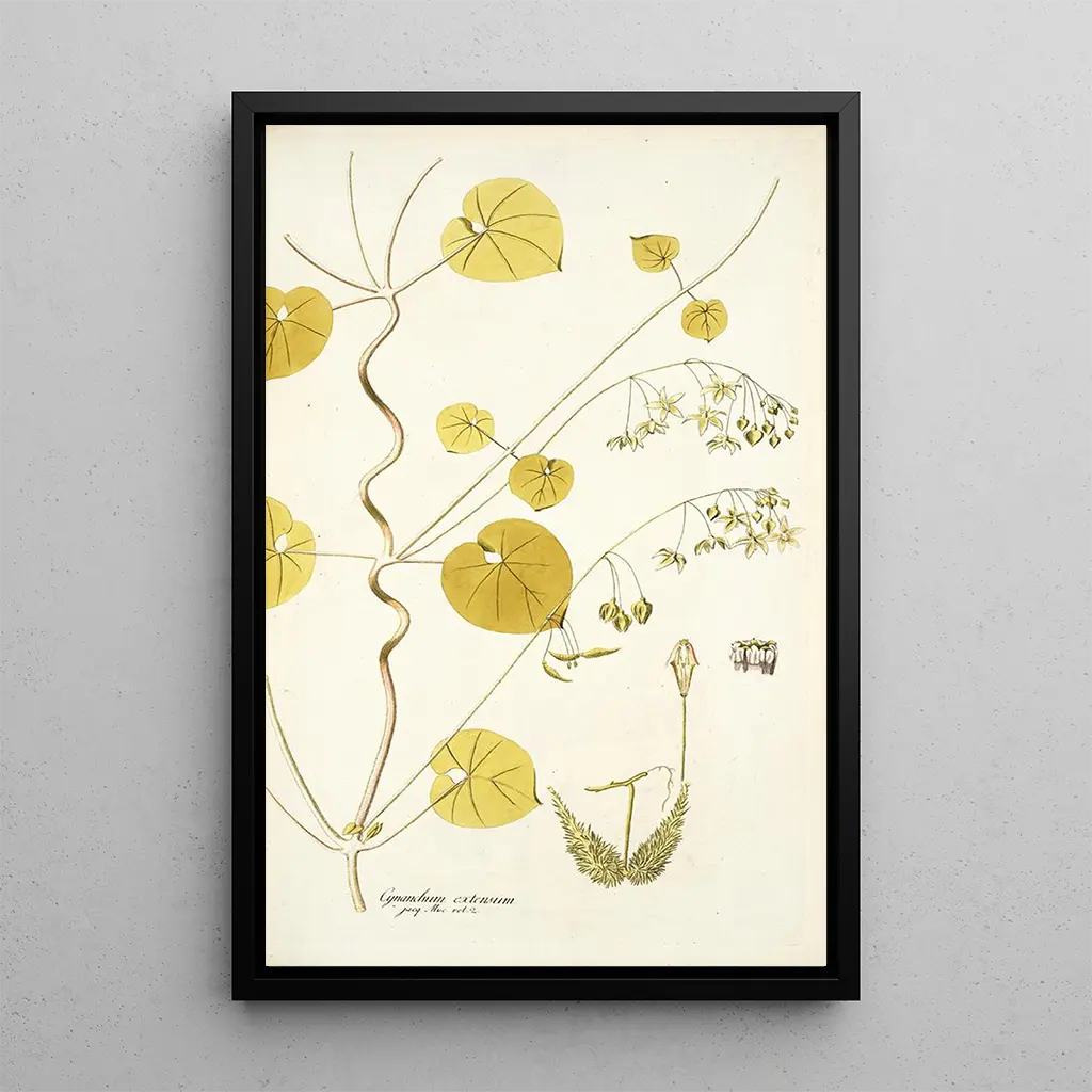 Taidegrafiikka Cynanchum extensumista vie meidät maailmaan, jossa kasvillisuus kukoistaa vertaansa vailla olevalla rikkaudella. Tämä taulu, jonka on signeerannut Nikolaus Joseph Freiherr von Jacquin, esittelee harmonisen koostumuksen, jossa orgaaniset muodot sekoittuvat sulavasti. Värikkäät, syvistä vihreistä kirkkaisiin keltaisiin sävyihin ulottuvat värit luovat elävän ja dynaamisen ilmapiirin. Jacquinin hallitsema vesiväritekniikka mahdollistaa kasvien keveyden ja hienovaraisuuden vangitsemisen, kunnioittaen kasvilajin kauneutta.