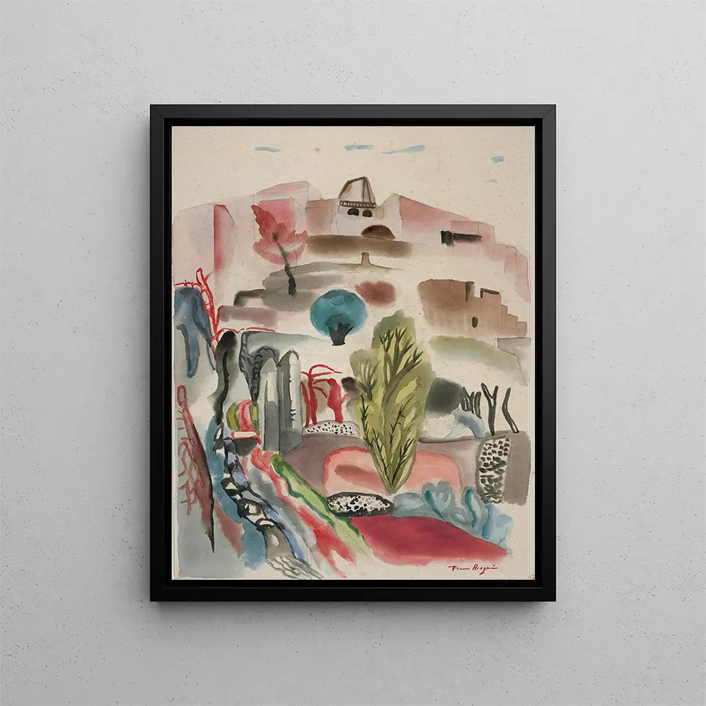 Frances Hodgkinsin tyyliä leimaa rohkea lähestymistapa väreihin ja muotoihin. "Colline aux cyprès" -teoksessa taiteilija käyttää rikasta ja ilmeikästä palettia, jossa eloisat sävyt sekoittuvat harmonisesti luoden lähes unenomaisen tunnelman. Cypress-puut, jotka ovat hänen työnsä tunnusmerkkejä, kohoavat ylpeinä, symboloiden sekä luonnon voimaa että haurautta. Kompositio on huolellisesti tasapainotettu, jokainen elementti sijoitettu tarkasti, mikä houkuttelee katsetta ja kutsuu tutkimaan. Hodgkins onnistuu muuttamaan tavallisen maiseman runolliseksi kohtaukseksi, jossa valo näyttelee keskeistä roolia, korostaen muotoja ja paljastaen yllättäviä yksityiskohtia. Tämä abstraktion ja figuurin yhdistelmä tekee hänen teoksestaan voimakkaan aikansa todistuksen, samalla pysyen ajattomana sieluun koskettavana kykynä.