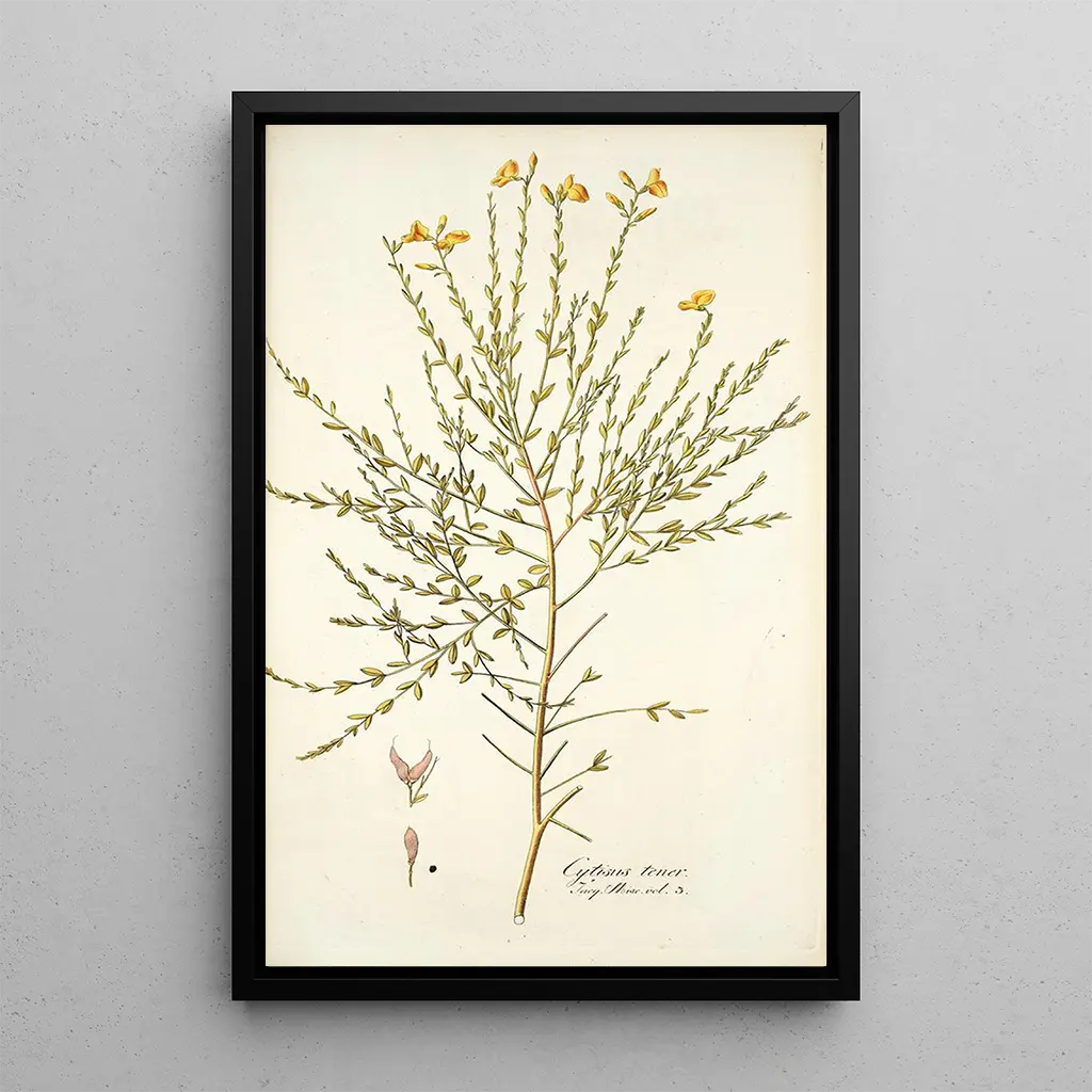 Cytisus tener, kasvitieteilijä ja taiteilija Nikolaus Joseph Freiherr von Jacquinin teos, herättää luonnollisen kauneuden keveyden sävyissä. Tämä taidegrafiikka korostaa pehmeitä sävyjä, jotka vaihtelevat hentävästä vihreästä kirkkaaseen keltaiseen, ja jotka kietoutuvat luoden rauhallisen ilmapiirin. Vesiväritekniikka, jota käytetään hienovaraisesti, mahdollistaa terävoiden läpinäkyvyyden ja lehtien hienostuneisuuden vangitsemisen. Jokainen yksityiskohta on huolellisesti toteutettu, kutsuen katsojan sukeltamaan tämän kasvin kukkivaan maailmaan. Kompositio, joka on hyvin tasapainotettu, tarjoaa kokonaisnäkymän, joka juhlistaa luonnon loistoa.