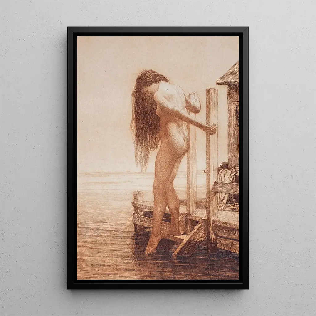 Tässä kiehtovassa teoksessa Cilius Andersen johdattaa meidät rauhan ja arvokkuuden maailmaan. Kompositio korostaa eleganttia naista, joka kylpee rauhallisissa vesissä, ympäröitynä rehevällä luonnolla. Pehmeät ja pastellivärit luovat rauhoittavan tunnelman, kun taas valo leikkii hienovaraisesti uima-asuinen naisen iholla, korostaen hänen kauneuttaan. Taiteilijan tekniikka, yhdistäen realismia ja impressionismia, herättää tämän intiimin kohtauksen eloon ja kutsuu katsojan uppoutumaan tähän rauhan hetkeen.