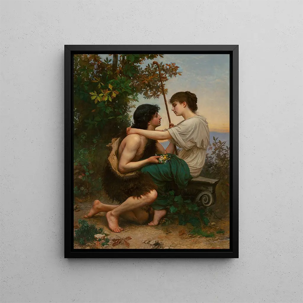 Taiteen maailmassa jotkut teokset ylittävät pelkän maalauksen kehyksen ja muuttuvat visuaalisiksi kertomuksiksi, jotka ovat täynnä tunnetta ja runoutta. Camille Félix Bellangerin "Daphnis et Chloé" on loistava esimerkki tästä. Tämä teos, joka on saanut innoituksensa mytologisesta rakkaustarinasta Daphnisin ja Chloén välillä, kuvaa luonnon kauneutta ja tunteiden puhtautta. Sukeltaessaan tähän taidetulosteeseen katsoja siirtyy välittömästi maailmaan, jossa rakkaus ja luonto kietoutuvat toisiinsa, luoden sekä rauhallisen että lumoavan ilmapiirin. Herkät piirteet ja värien rikkaus kutsuvat syvälliseen pohdintaan, tehden jokaisesta katselukerrasta ainutlaatuisen ja henkilökohtaisen.