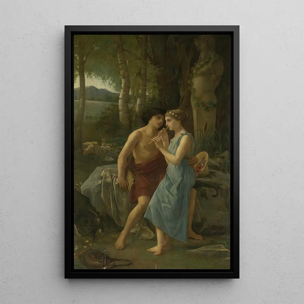 Dans cette œuvre emblématique, Pierre Cabanel capture l'essence même de l'amour naissant entre Daphnis et Chloé. La composition est riche en couleurs chaudes, avec des tons de rose et de doré qui évoquent la douceur des sentiments. Les personnages, délicatement peints, semblent presque flotter dans un monde de rêve, où la nature les entoure de sa beauté. La technique de Cabanel, mêlant réalisme et romantisme, crée une atmosphère intimiste et poétique, invitant le spectateur à plonger dans cette histoire d'amour intemporelle.