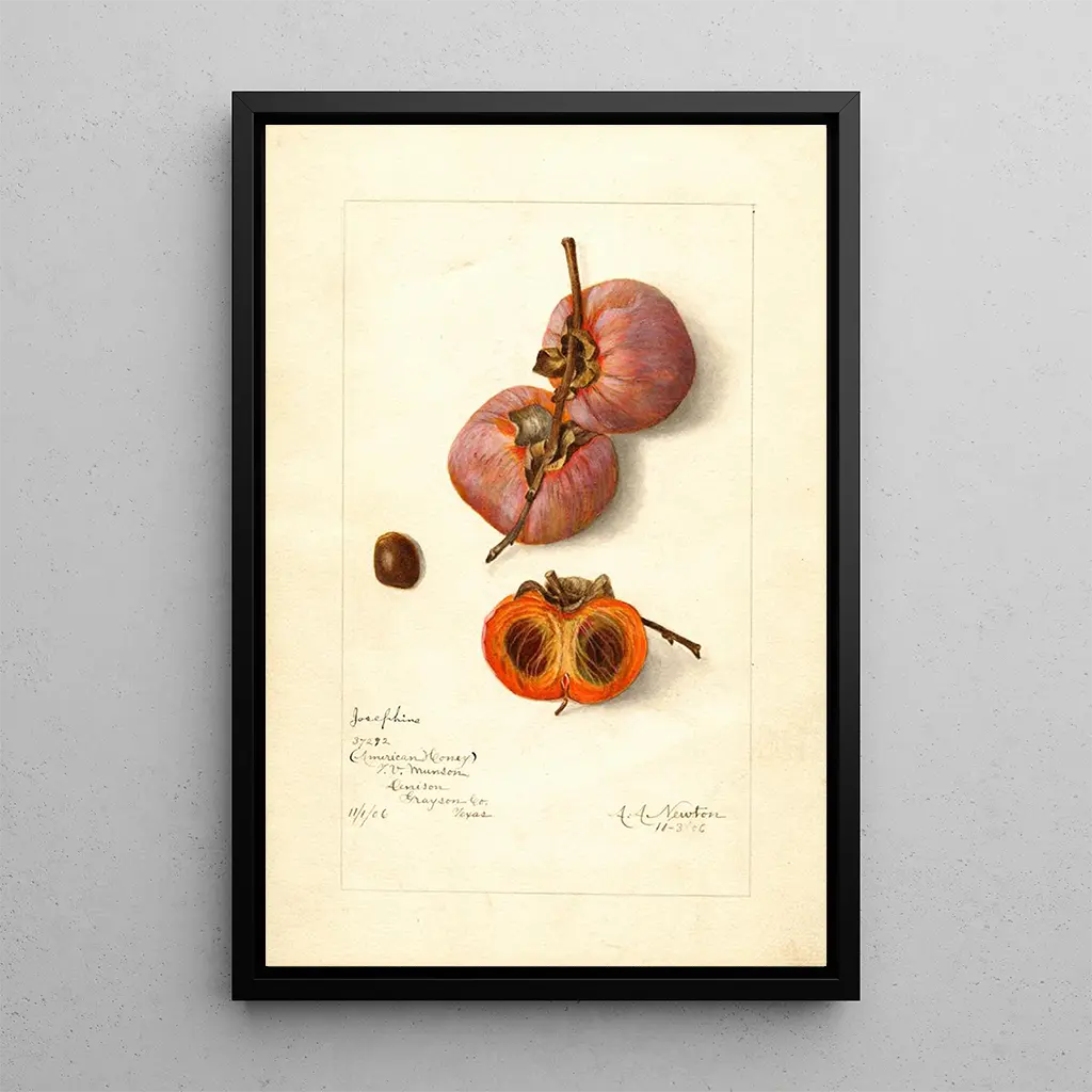 Diospyros Josephine, Amanda Almira Newtonin merkittävä teos, kuvaa kukkien eleganssia ja hienostuneisuutta pehmeiden ja rauhoittavien värien paletilla. Pastellisävyt sulautuvat harmonisesti yhteen, luoden taulun, joka näyttää hehkuvan valon alla. Newtonin tekniikka, joka yhdistää vesiväriä ja mustetta, herättää jokaisen terälehden ja lehden eloon ja kutsuu katsojan uppoutumaan salaperäiseen puutarhaan. Tämä kangas on todellinen kutsu unelmointiin, jossa luonto ilmaisee koko loistonsa.