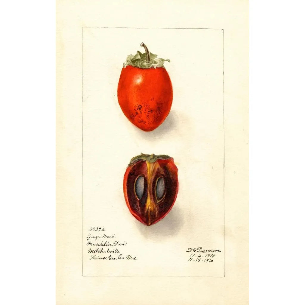 taidegrafiikka Diospyros Zengi Maru Deborahin Griscom Passmoren teoksesta on todellinen juhla luonnon kauneudelle. Tämä teos, täynnä yksityiskohtia, kuljettaa meidät maailmaan, jossa vihreän sävyt sekoittuvat kultaisiin valonpilkahduksiin, luoden sekä rauhoittavan että virkistävän tunnelman. Vesiväritekniikka, joka on hallittu hienovaraisesti, korostaa lehtien ja hedelmien herkkää rakennetta, kutsuen katsojan ihailemaan jokaisen elementin tarkkuutta. Kokonaisuus herättää syvää rauhaa, ikään kuin voisi melkein tuntea kevyen tuulen lempeän kosketuksen oksien läpi.